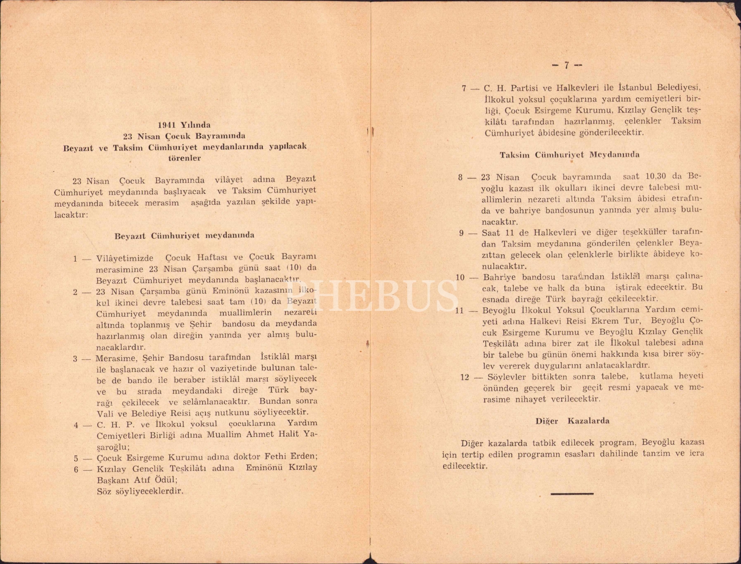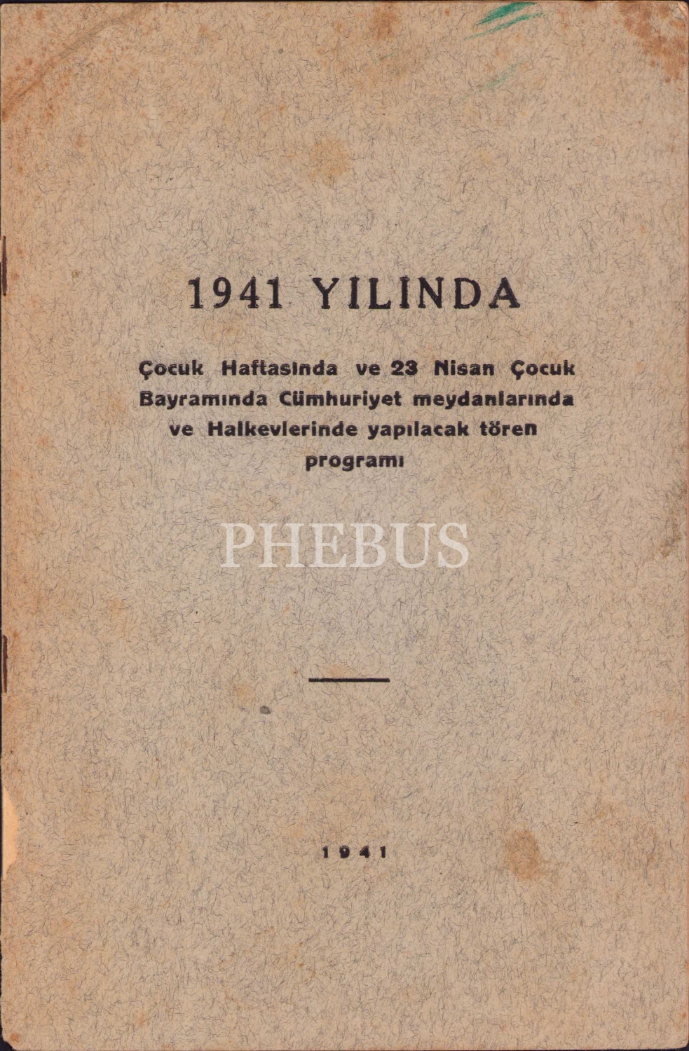 1941 Yılında Çocuk haftasında ve 23 Nisan Çocuk Bayramında Cumhuriyet meydanlarında ve Halkevlerinde yapılacak tören programı, 8 sayfa, ön kapak yırtık, 14x21 cm