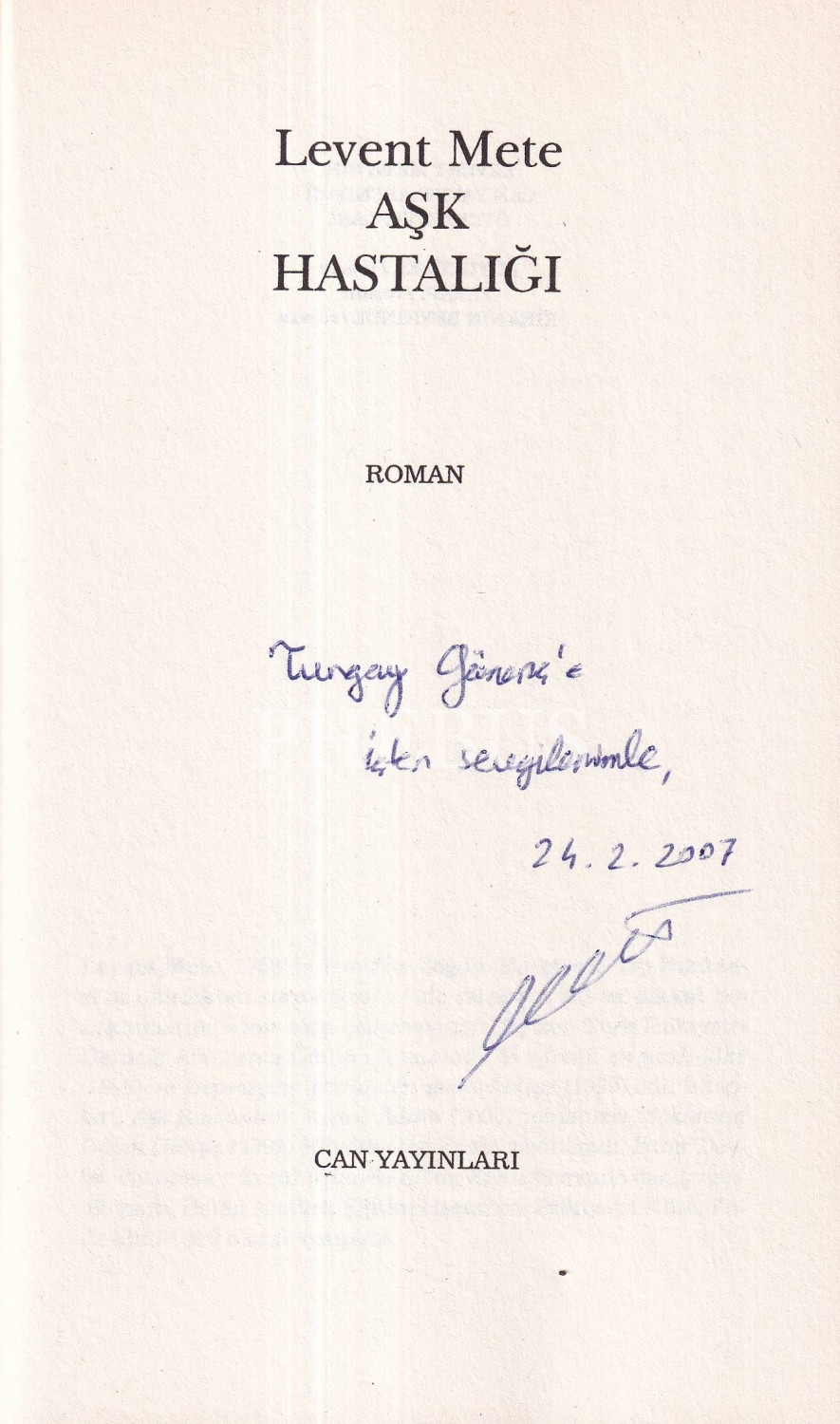 İthaf, "Turgay Gönenç'e içten sevgilerimle, 24. 02. 2007, Levent Mete" şeklindedir.