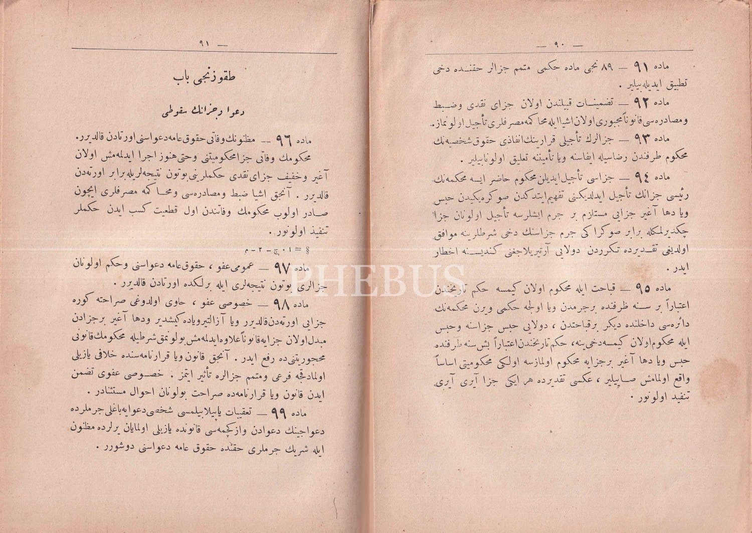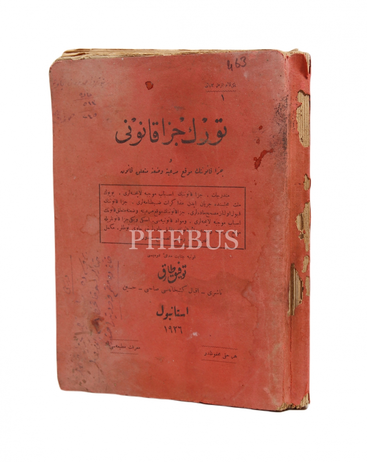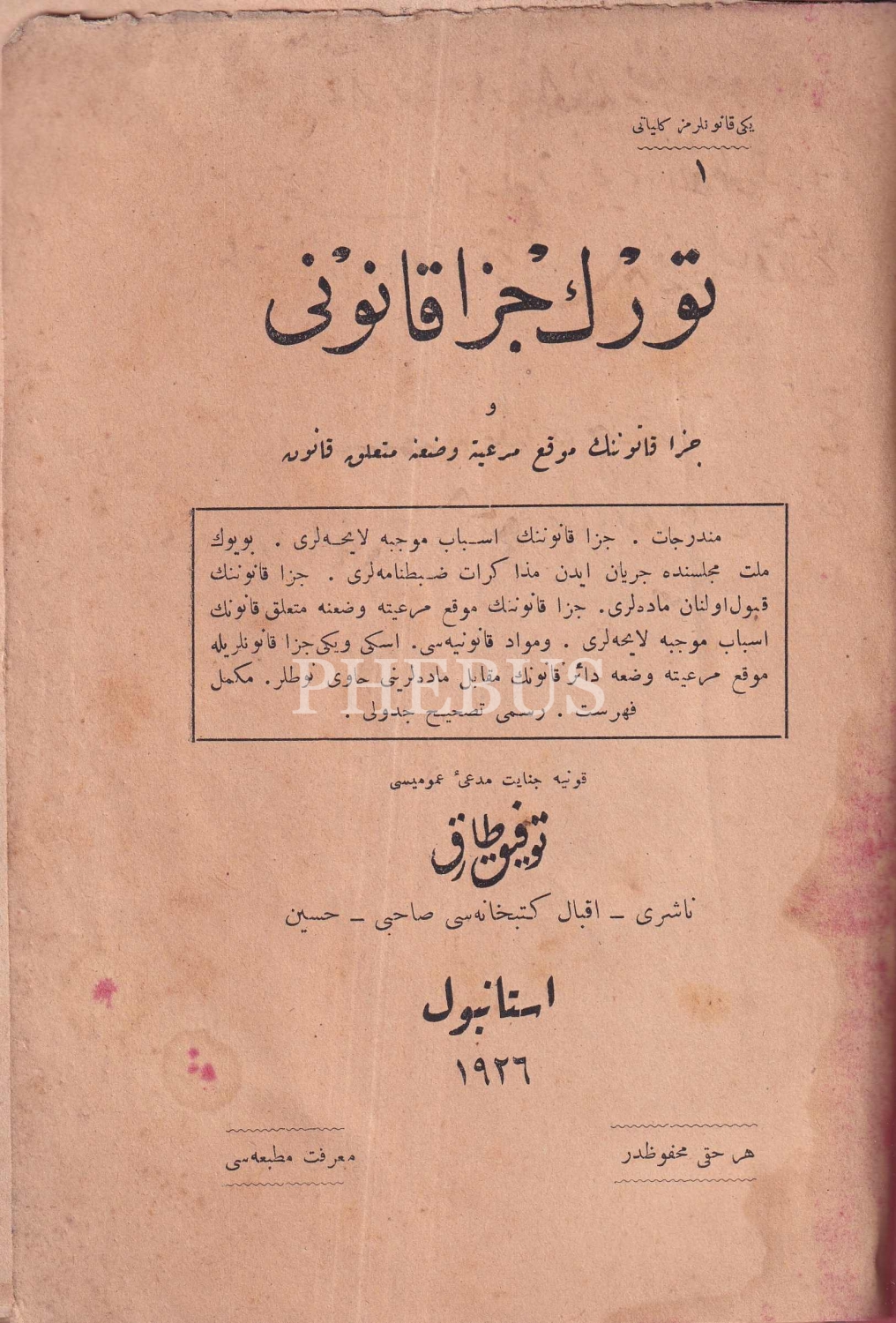 Osmanlıca Türk Ceza Kanunu, Tevfik Tarık, İstanbul 1926, 317 sayfa, 21x15 cm,