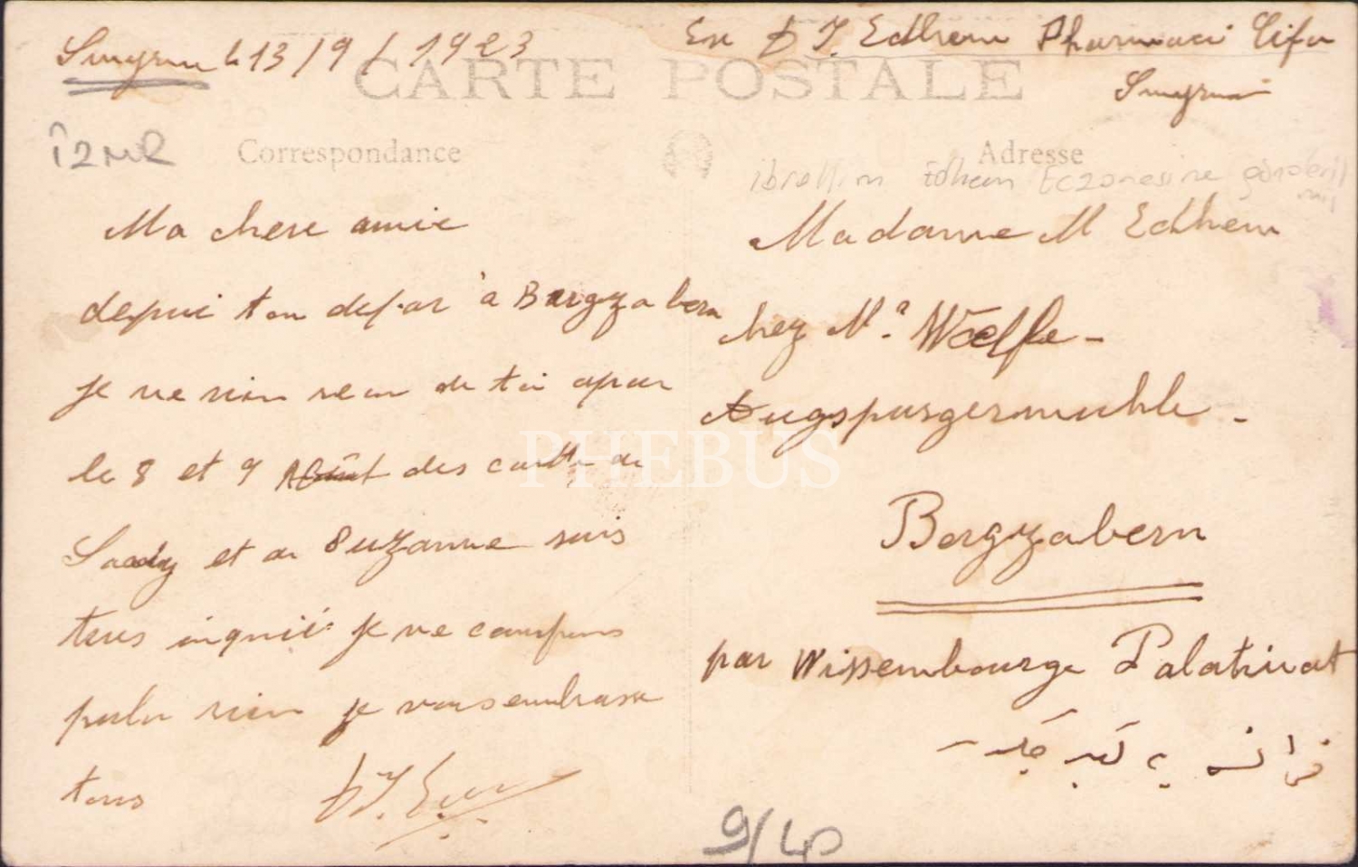 Fransızca, İbrahim Ethem eczanesine gönderilmiş, Smyrne [İzmir] adresli kart, 1923