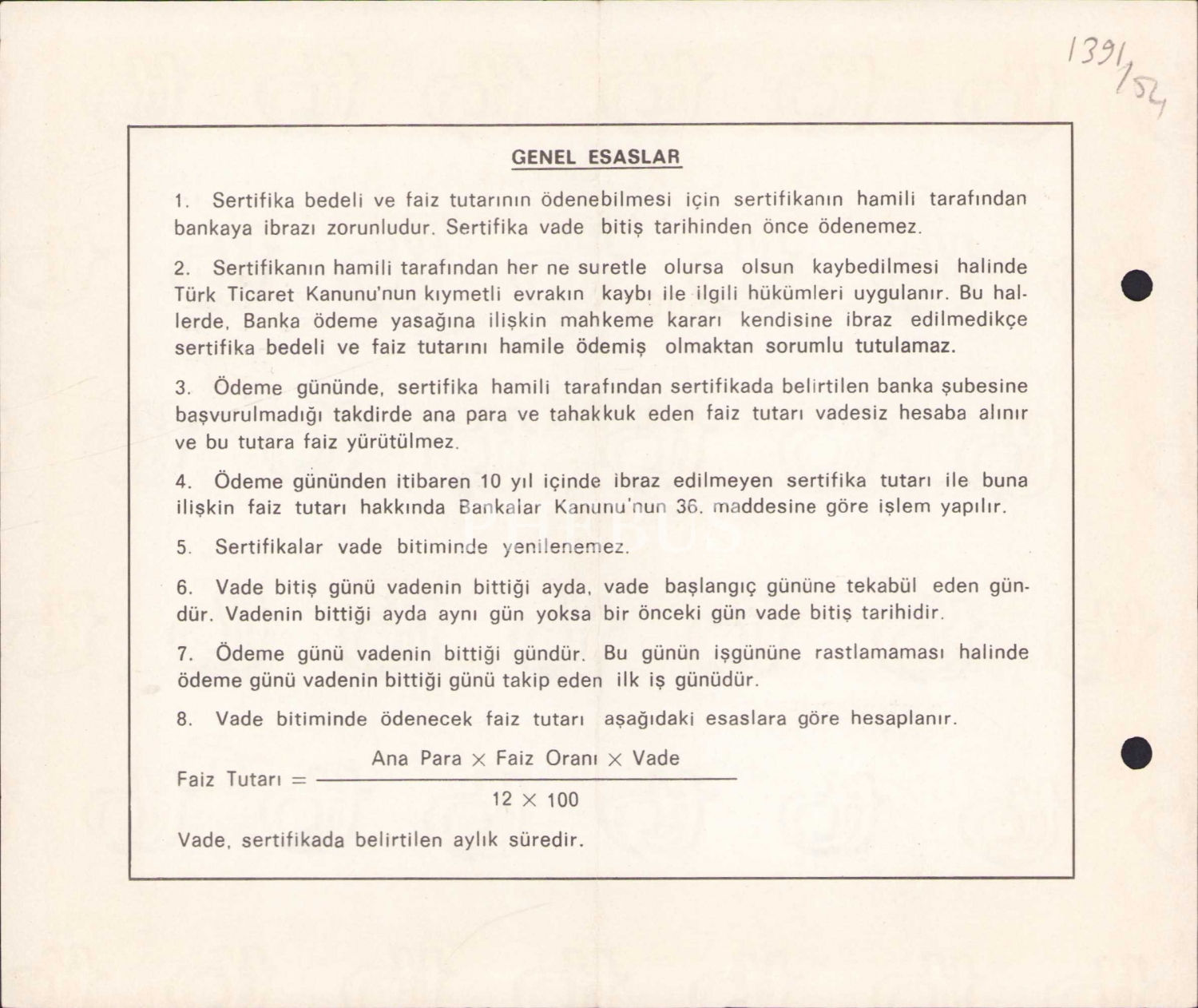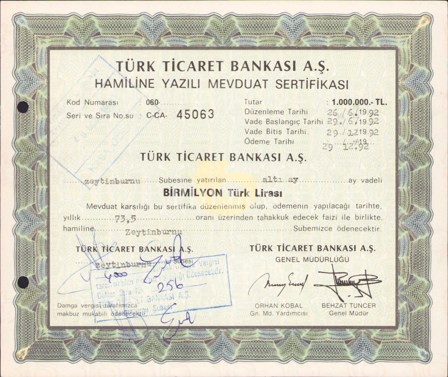 Türk Ticaret Bankası A.Ş. mevduat sertifikası, 20x16 cm