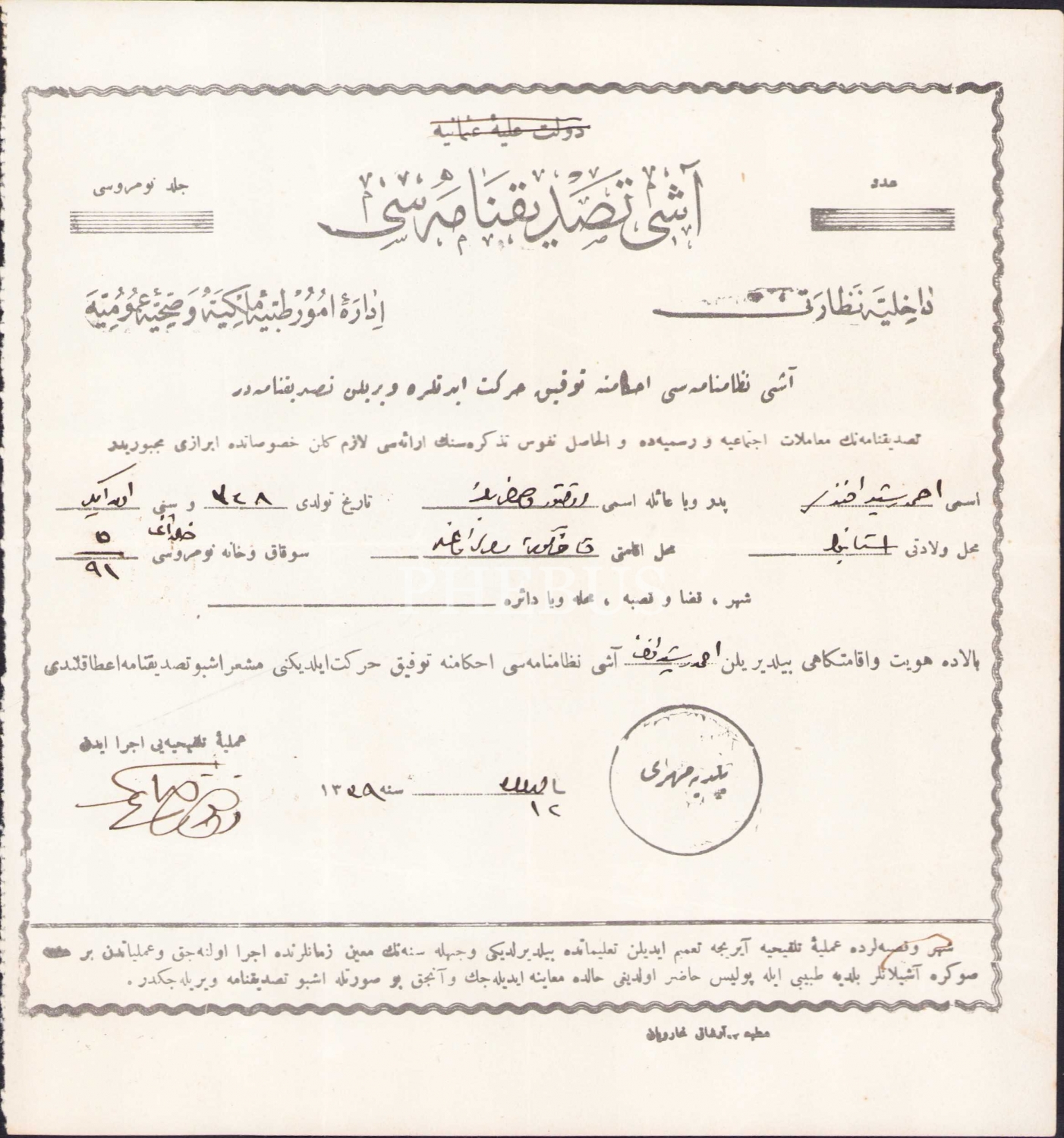 Osmanlıca Aşı Tasdiknamesi, 1329 tarihli, Ahmed Rüşdi Bey'e ait