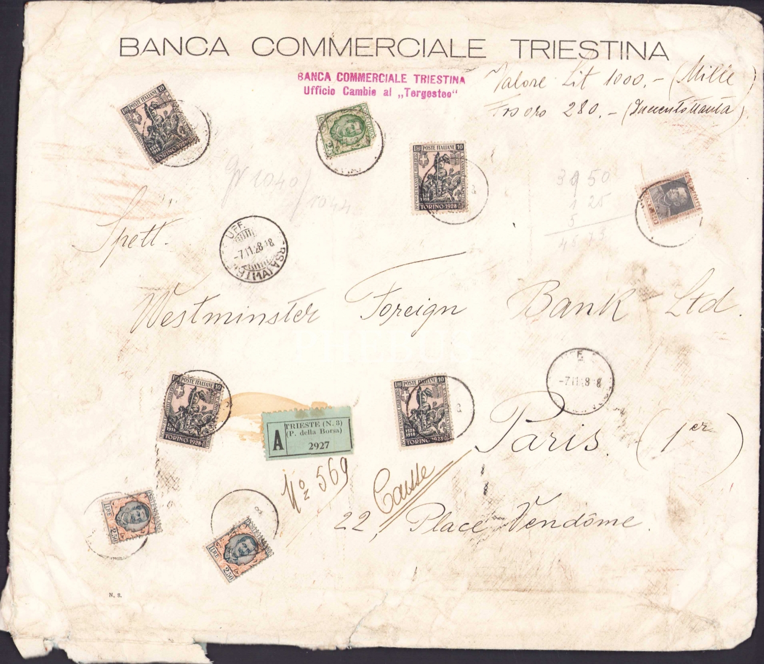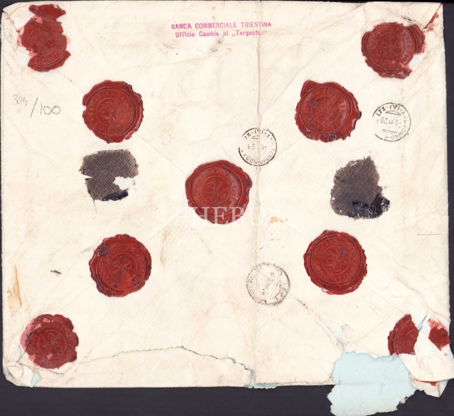 Banca Commerciale Triestina antetli, damgalı, postadan geçmiş zarf, 20x27 cm