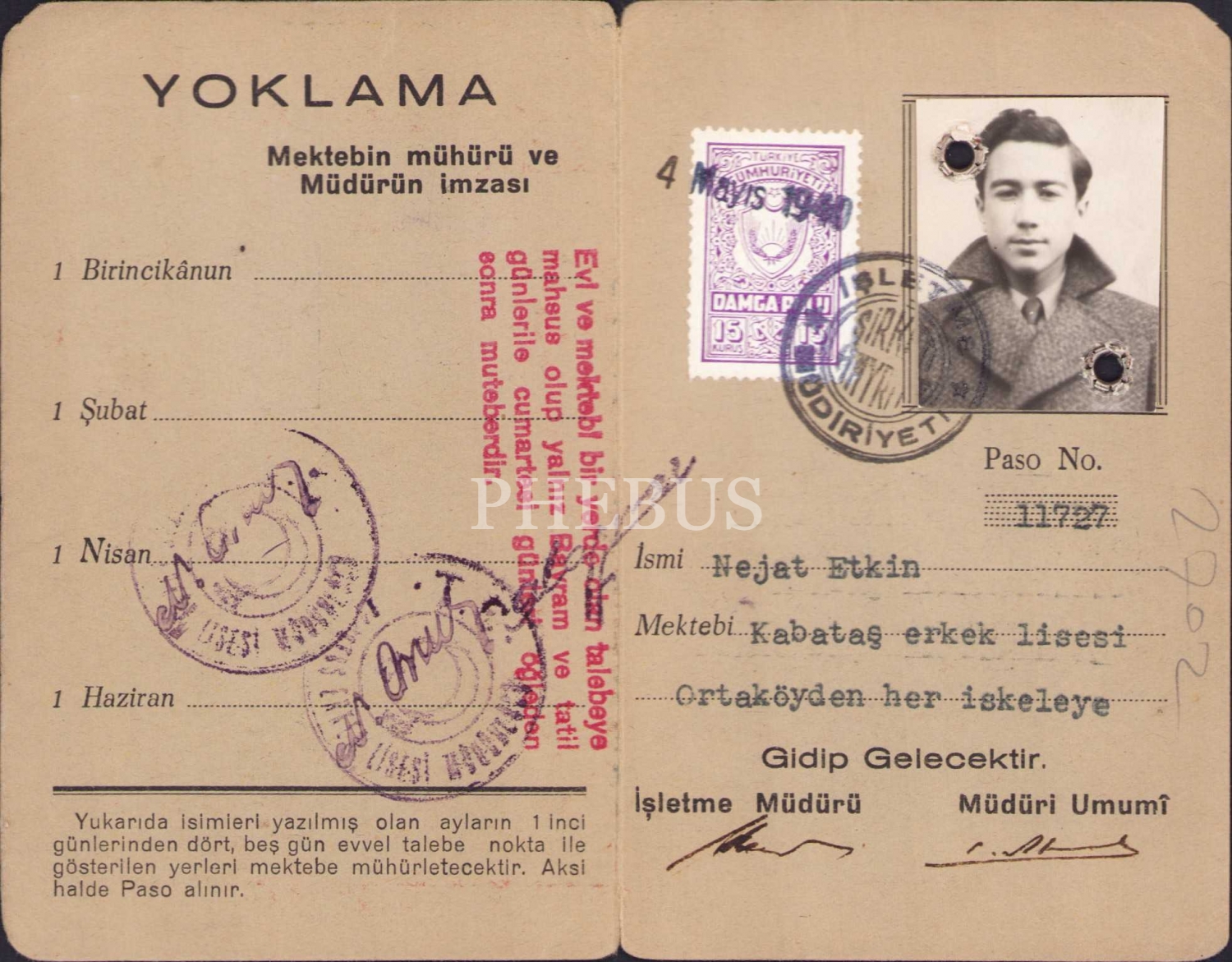 Şirketi Hayriyye Rumeli Ciheti talebe pasosu, 1940, 7x12 cm