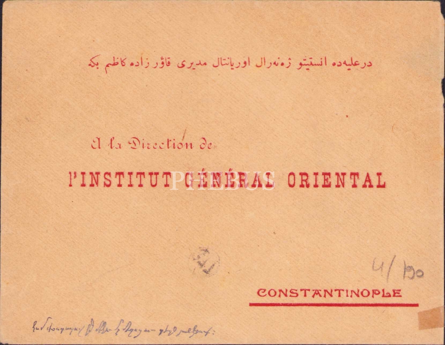 De la Direction de L'institut General Oriental, Constantinople antetli Osmanlıca - Fransızca Zarf, postadan geçmiş
