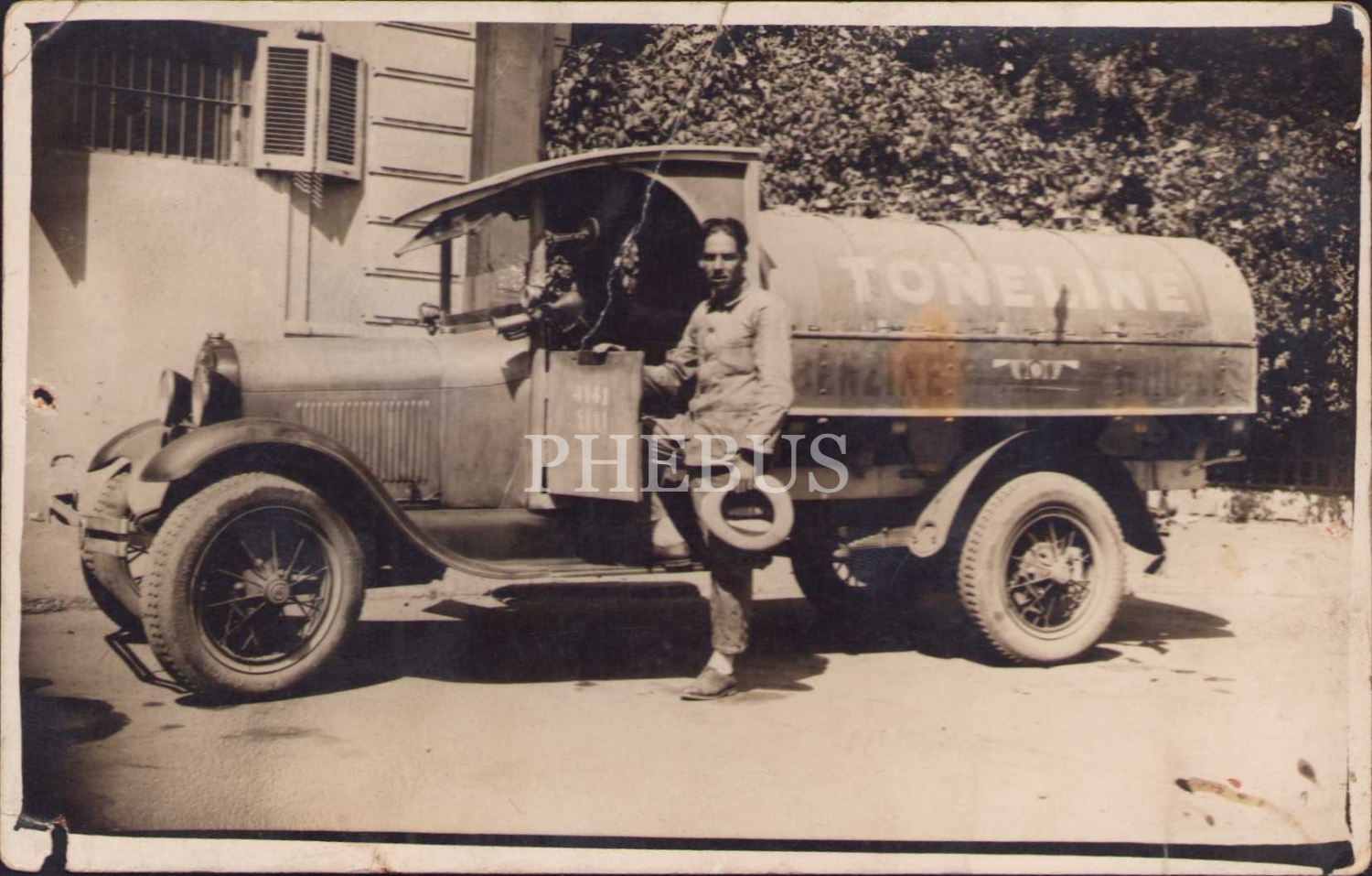 Erken dönem Toneline Benzine yazılı araç önünde hatıra, Arapça 4141 yazılı