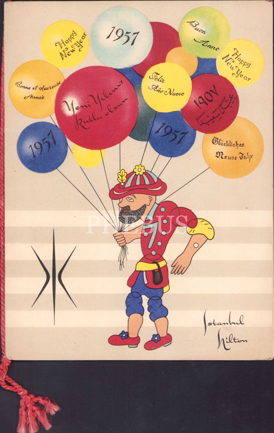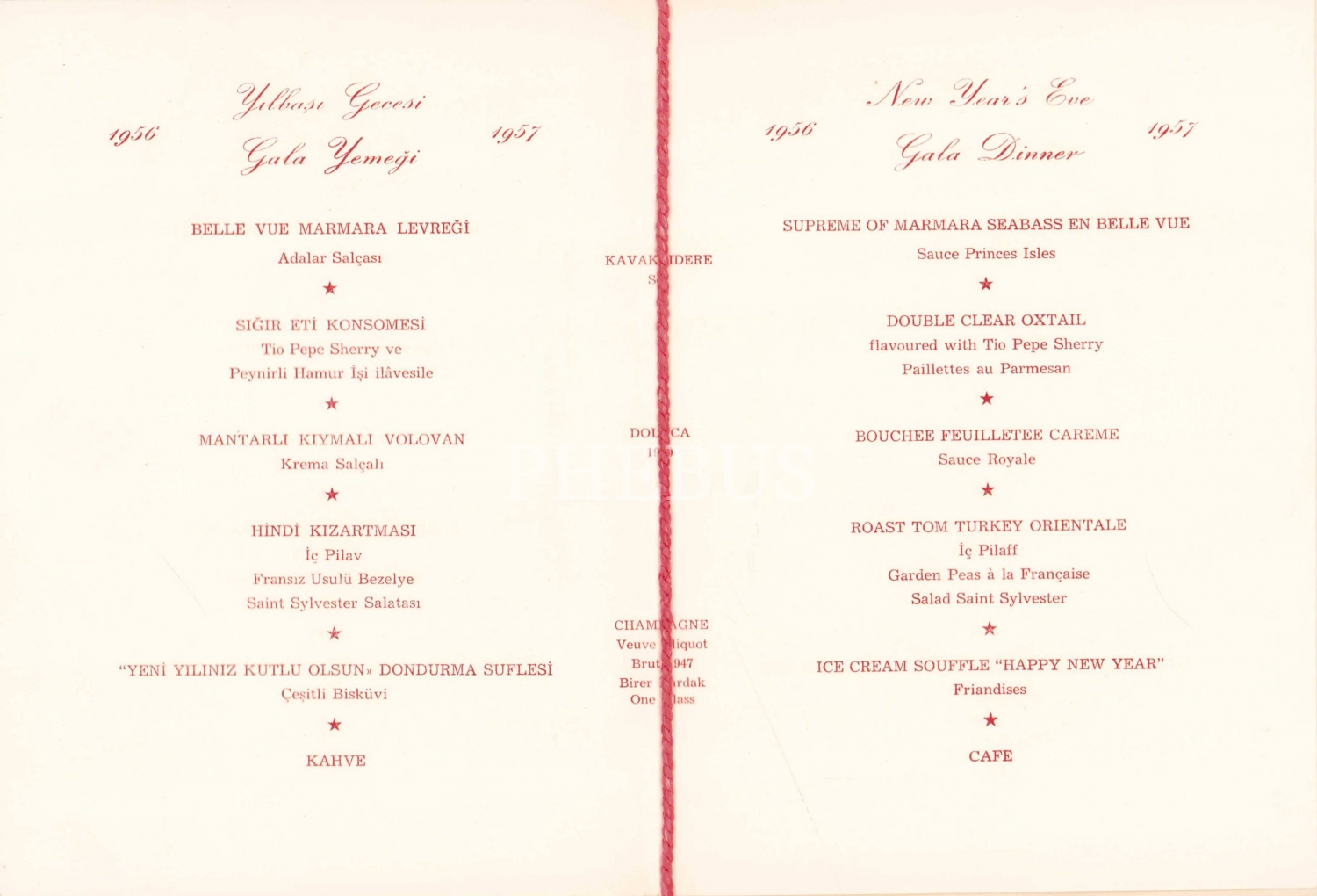 İstanbul Hilton'un 1957 Yılbaşı Gala Yemeği menüsü, İngilizce - Türkçe, postadan geçmiş, 15x20 cm