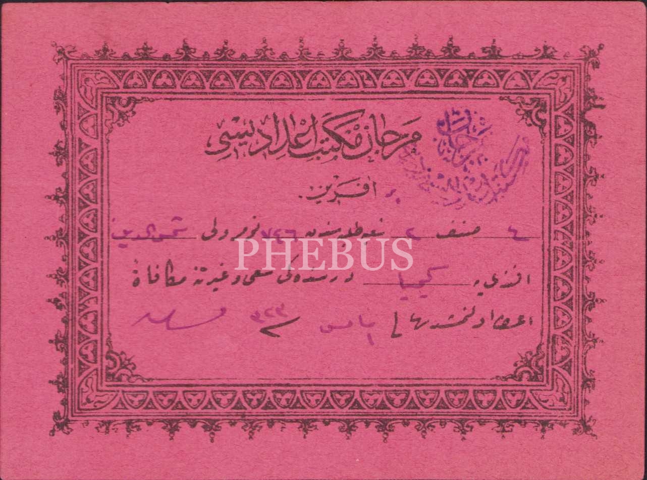 Osmanlıca aferin, Mercan Mektebi İdadisi, 1323 tarihli, 10x7 cm