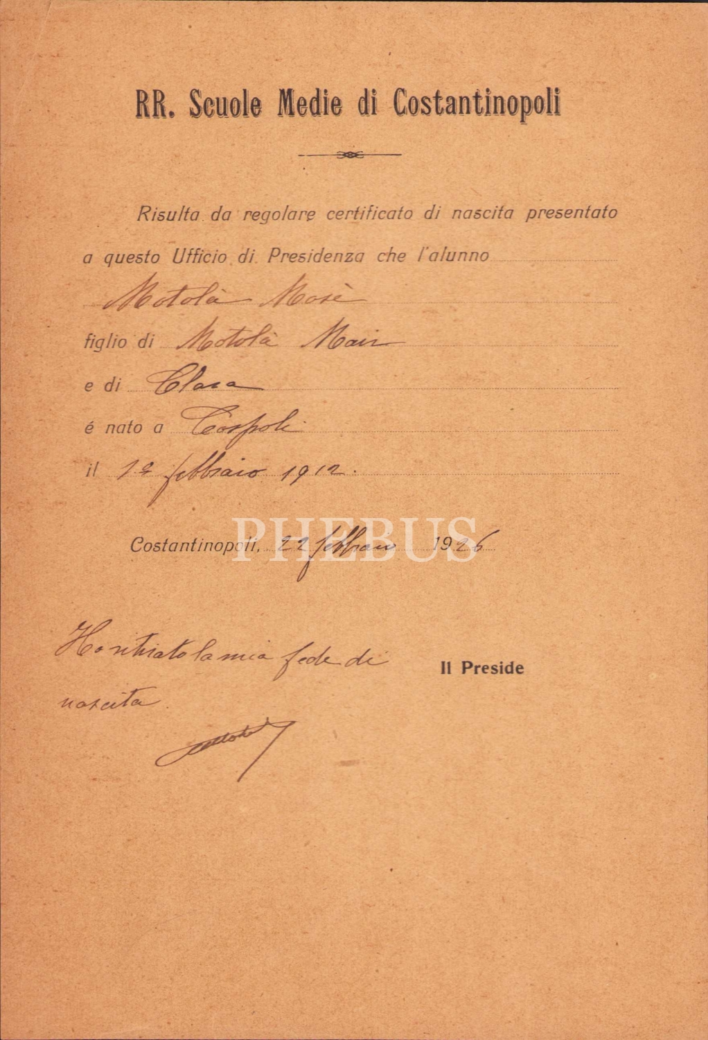 İtalyanca sertifika, Konstantinopolis ortaokulları 1926, 14x20 cm