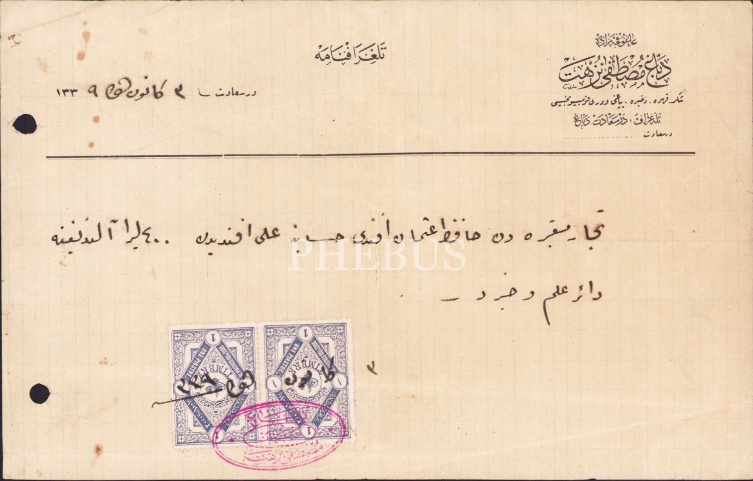 Osmanlıca Debbağ Mustafa Nüzhet antetli telgraf, 1339 Dersaadet, 23x13 cm