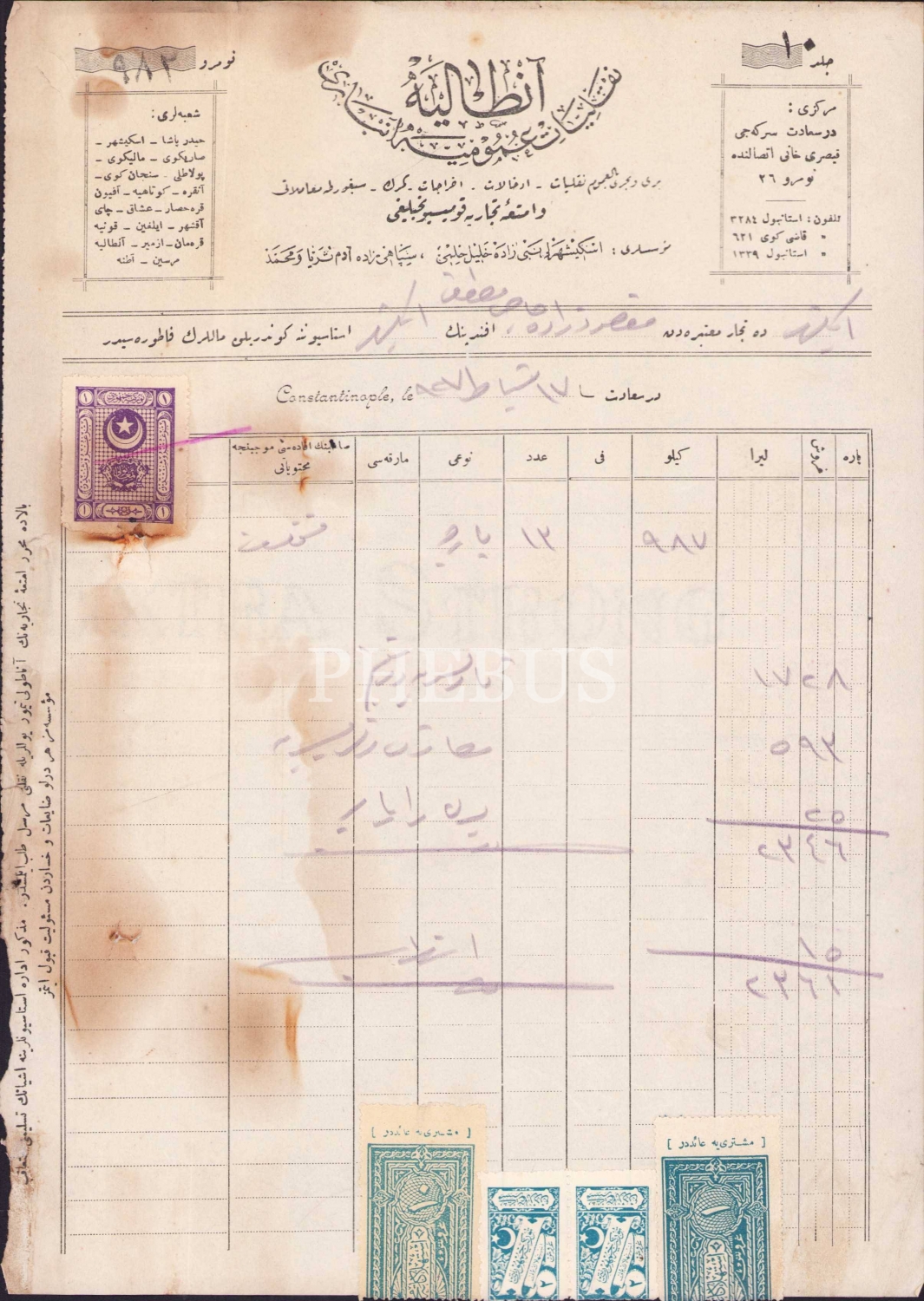Osmanlıca Antalya Nakliyat-ı Umumiye Anbarı antetli 1927 tarihli fatura, su görmüş, 19x28 cm