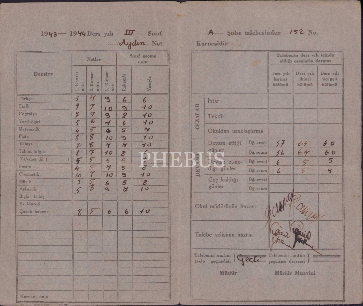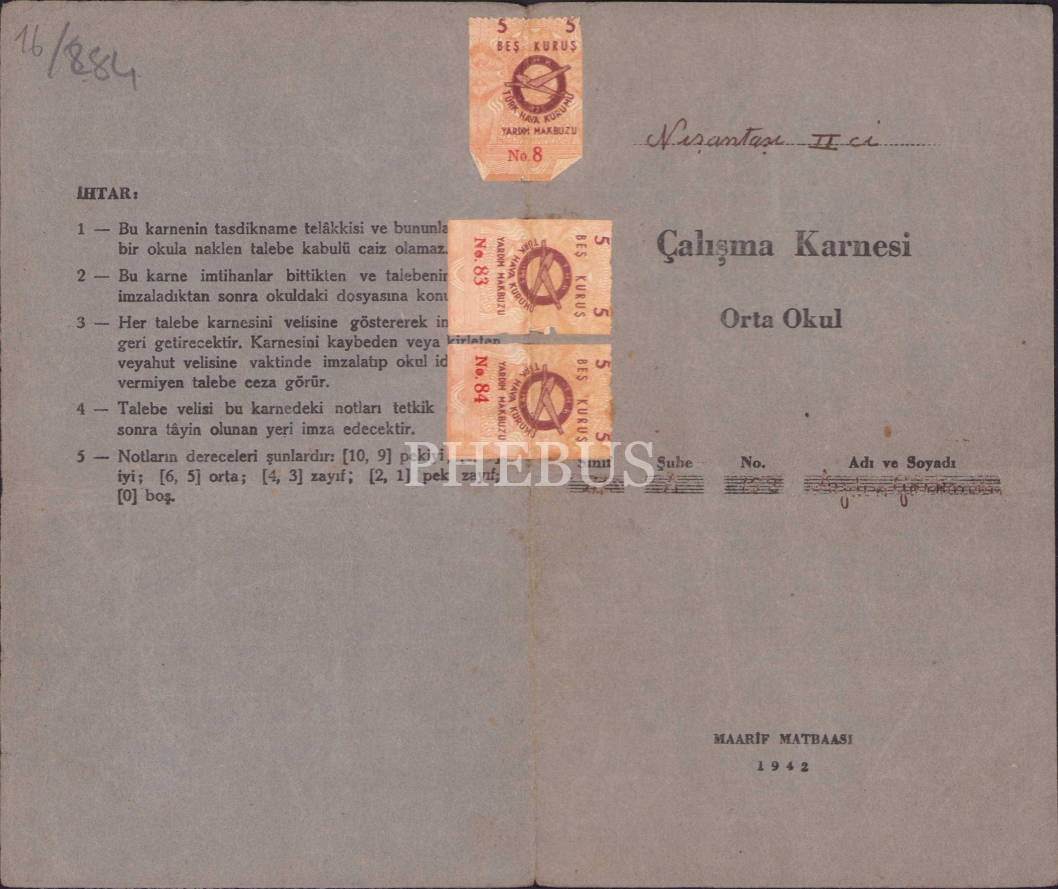 Nişantaşı Orta Okulu karne, 1944, 11x18 cm