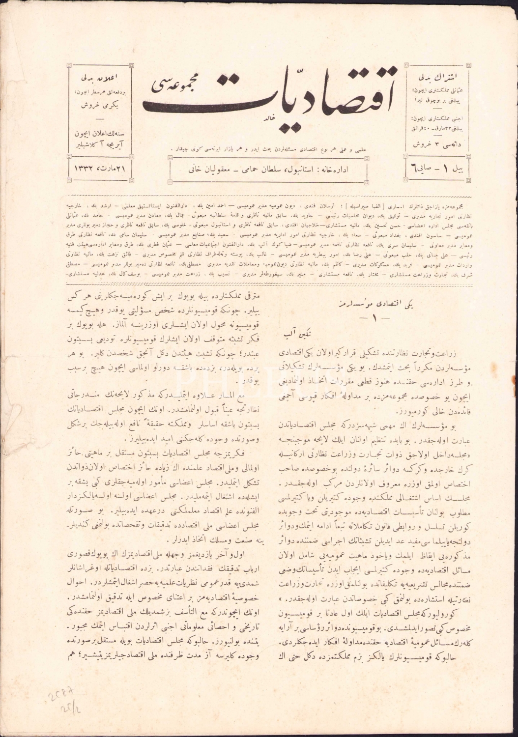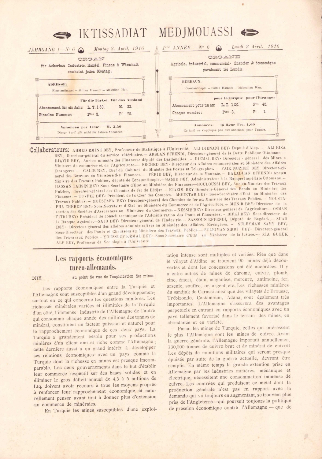 Arkasında 4 sayfa Fransızca İktisadiyat Mecmuası 3 Nisan 1916 sayısı mevcut.