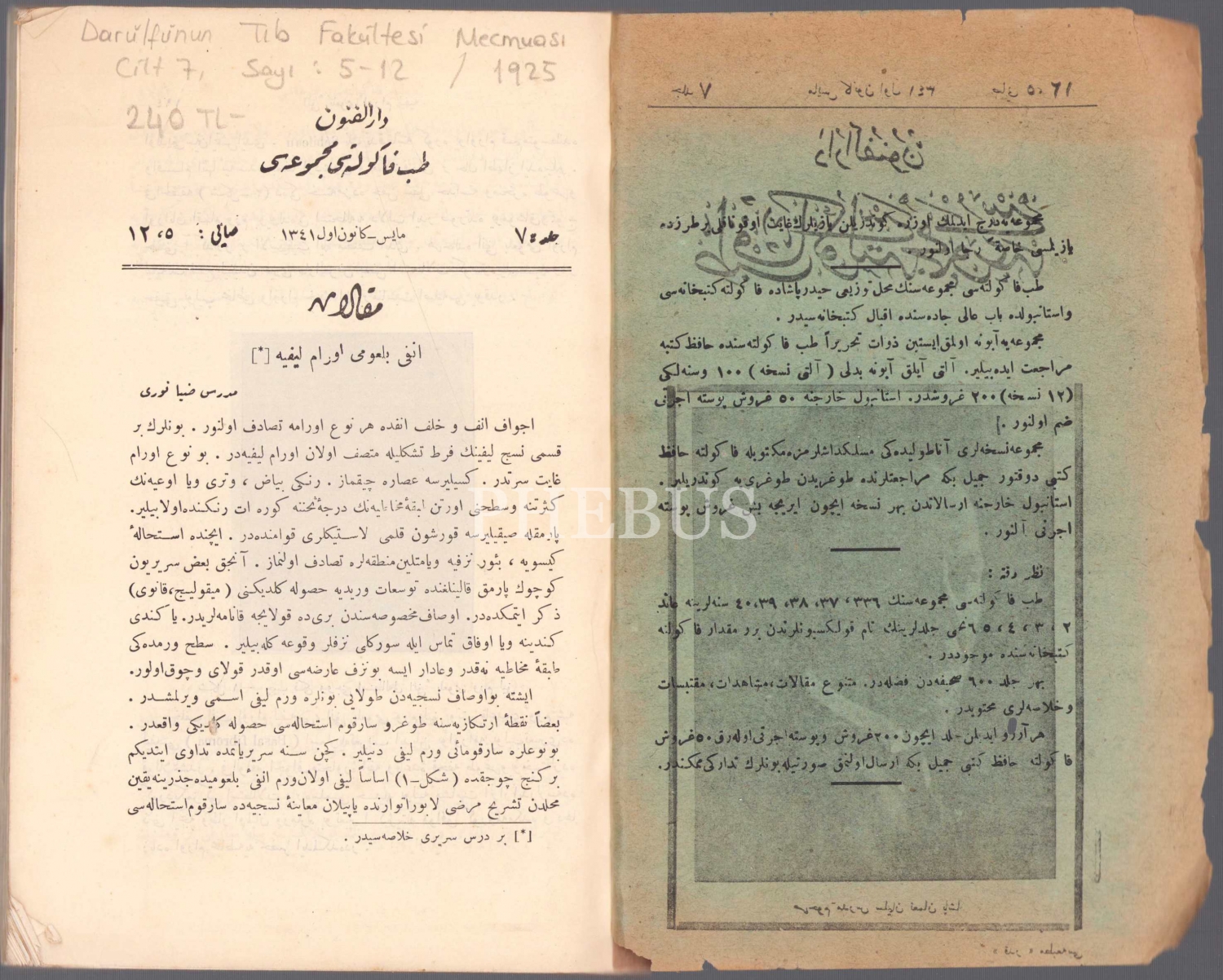 Darülfünun Tıp Fakültesi Mecmuası, Cilt 7, sayı 5-12, İstanbul 1341 Kader Matbaası, 376 sayfa