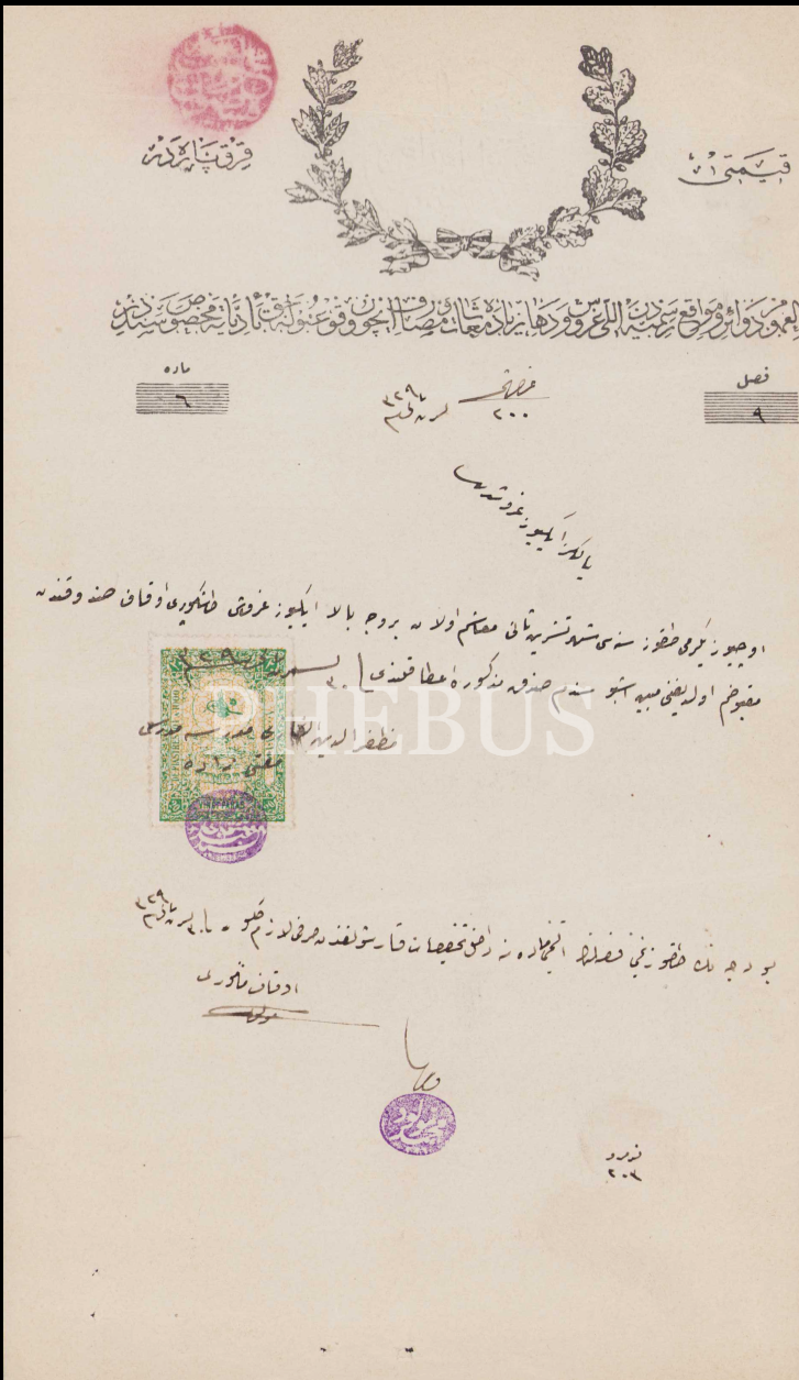 Osmanlıca soğuk damgalı evkaf makbuzu, 1329 tarihli, pullu, mühürlü, 16,5x28cm