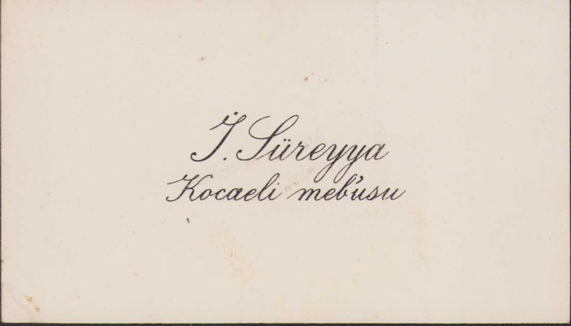 Kocaeli Mubusu İbrahim Süreyya Yiğit'ya ait kartvizit, arkası bayram tebriği yazılı, 9,5x5,5cm