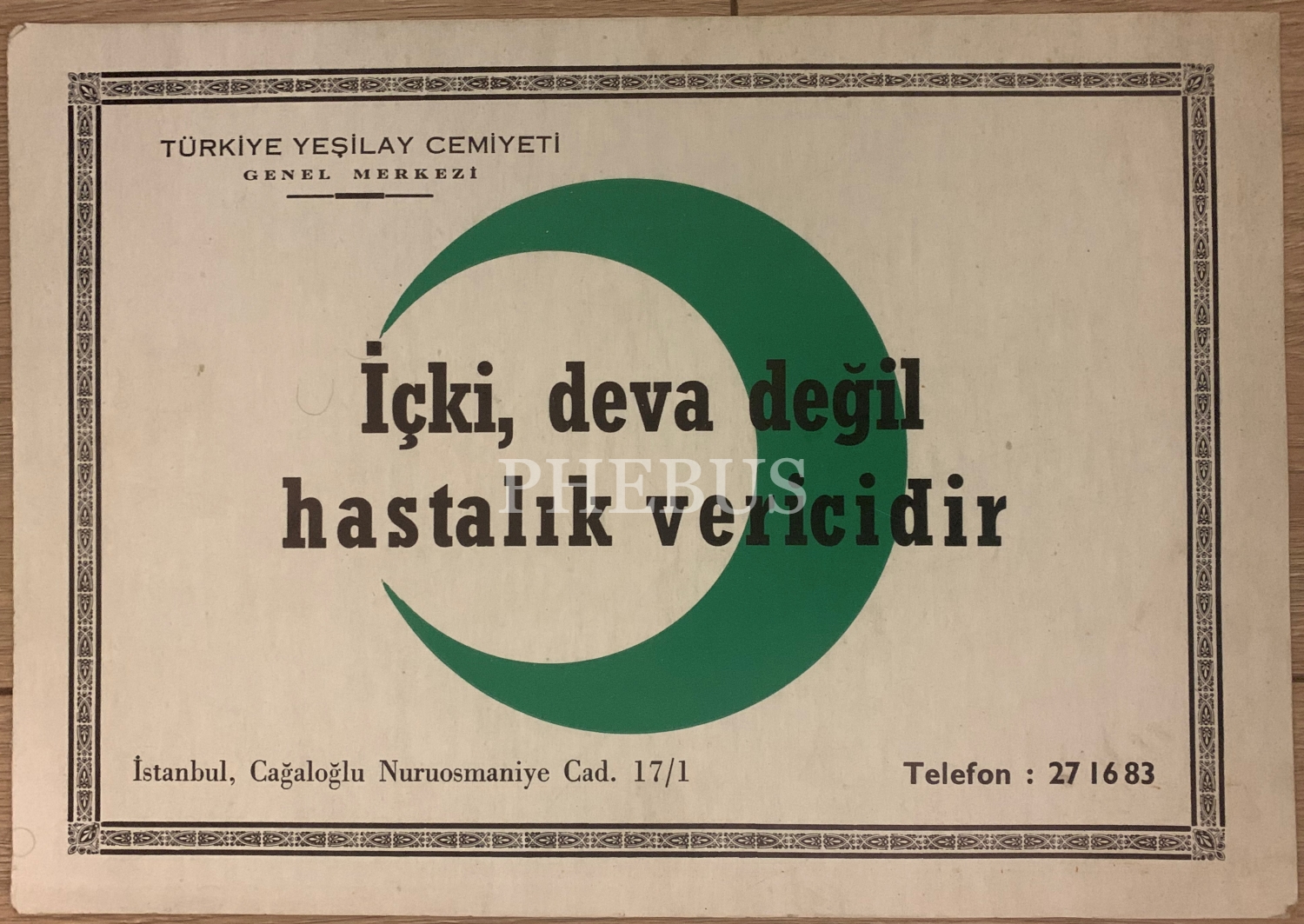 Türkiye Yeşilay Cemiyeti İçki Deva Değil Hastalık Vericidir Kartoneti 24 x 35 Cm