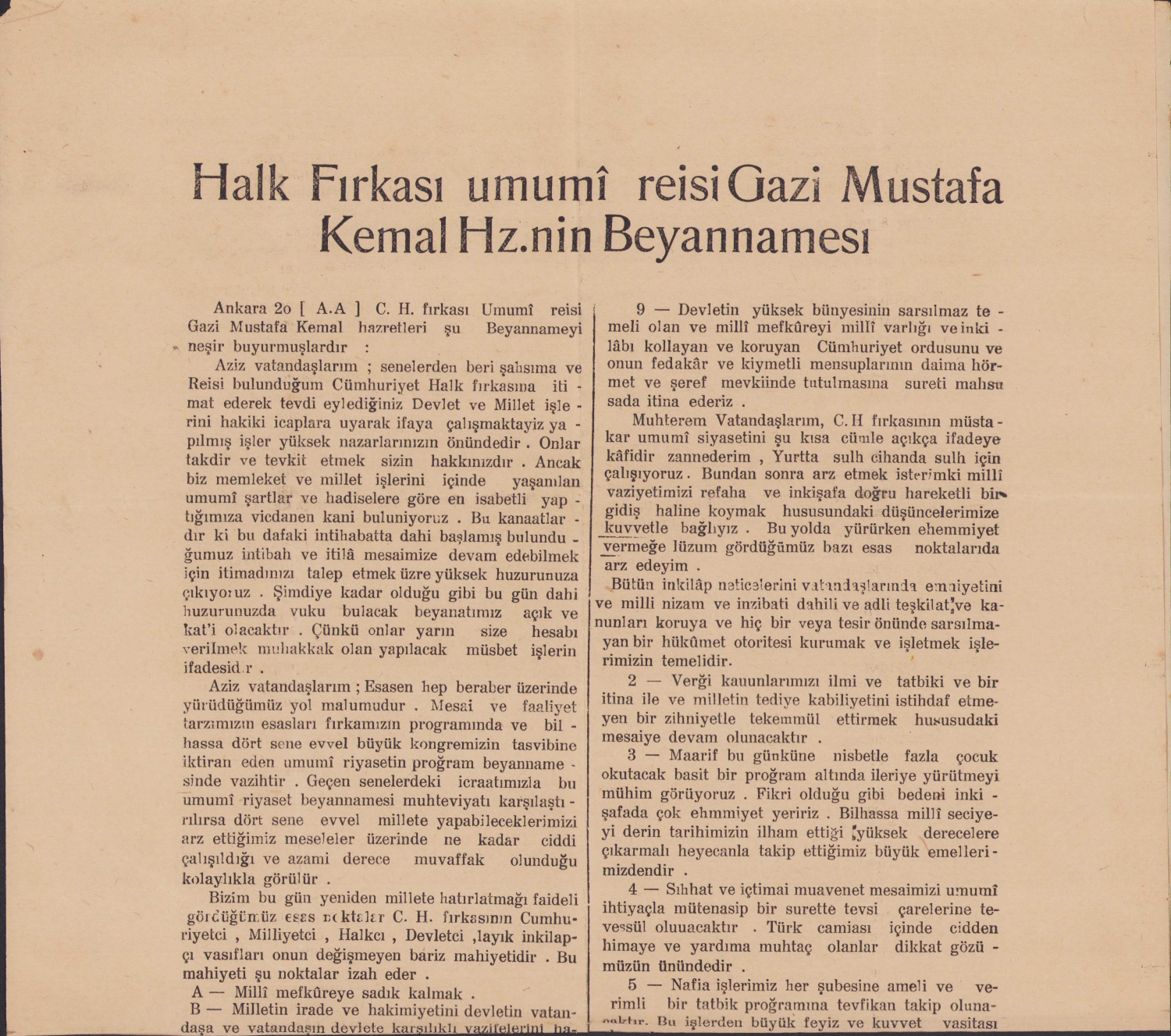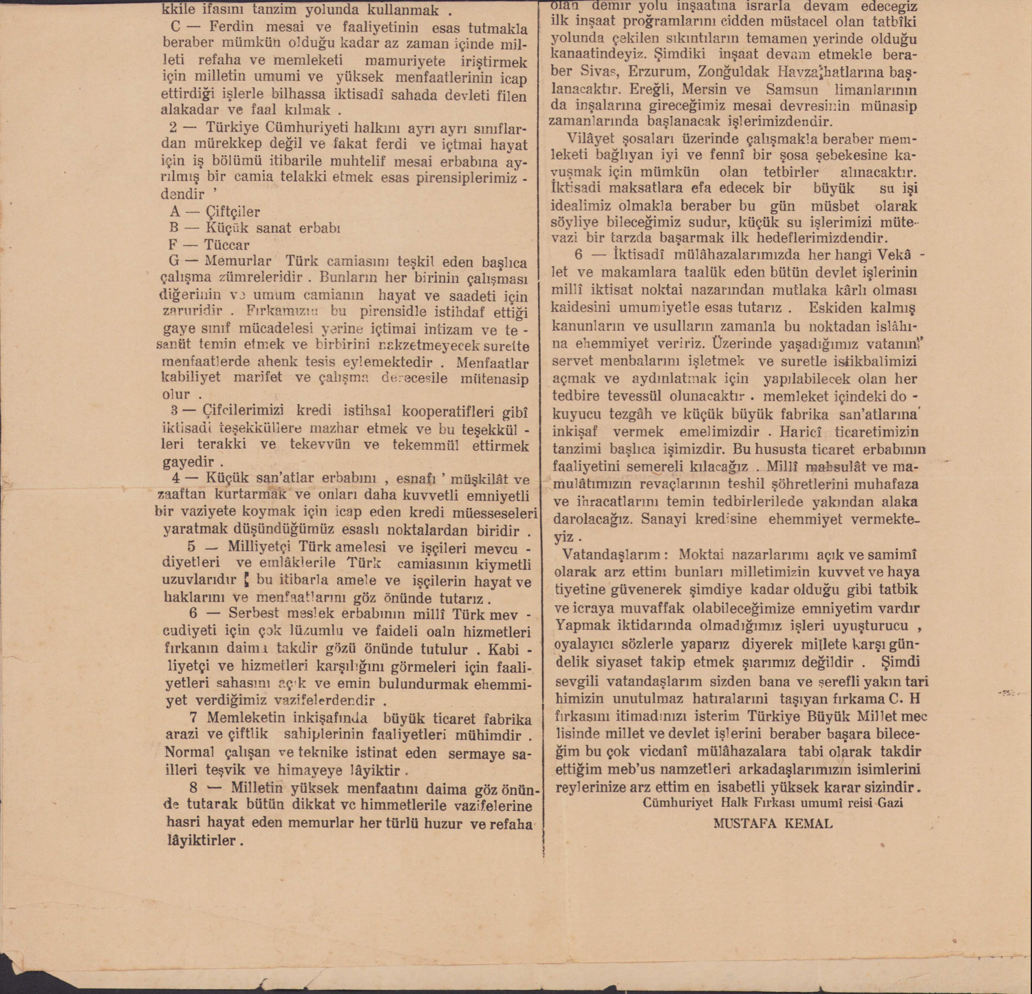 Halk Fırkası Umumi Reisi Gazi Mustafa Kemal Atatürk'ün beyanemesi, Atatürk seçim öncesi halka yönelik bilgi ve vaatlerini beyan ediyor, 31x56cm