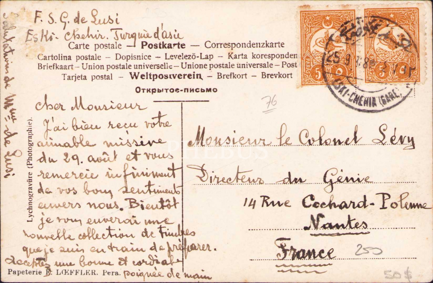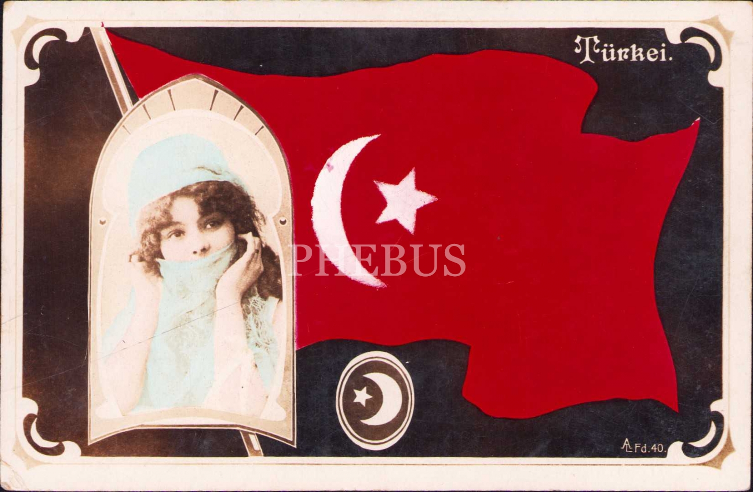 Osmanlı dönemi, güzel kadın ve Türk bayrağı görselli, Almanya baskısı, Editör F. Loeffler, Pera, bir kenarında küçük kırık var