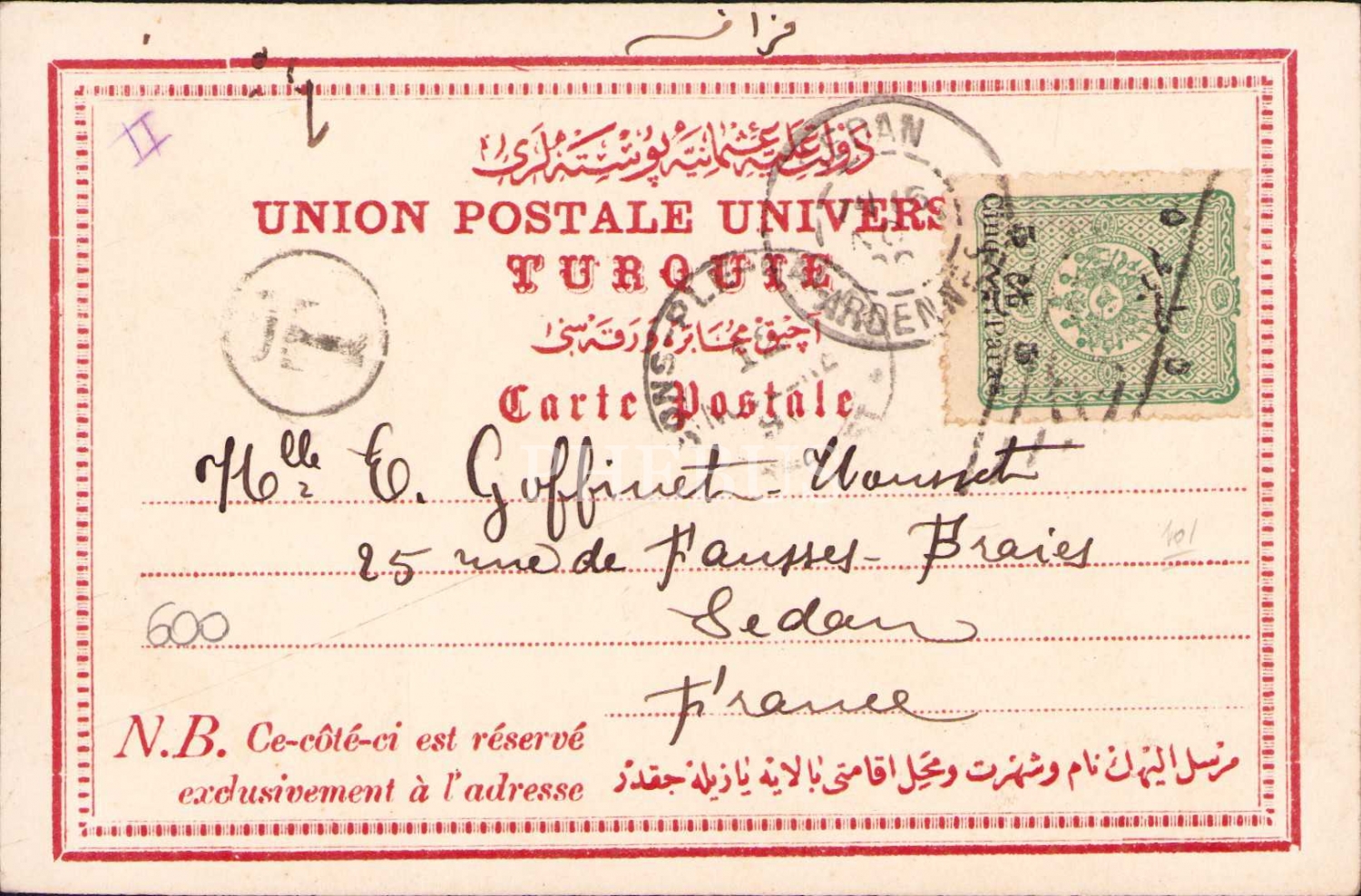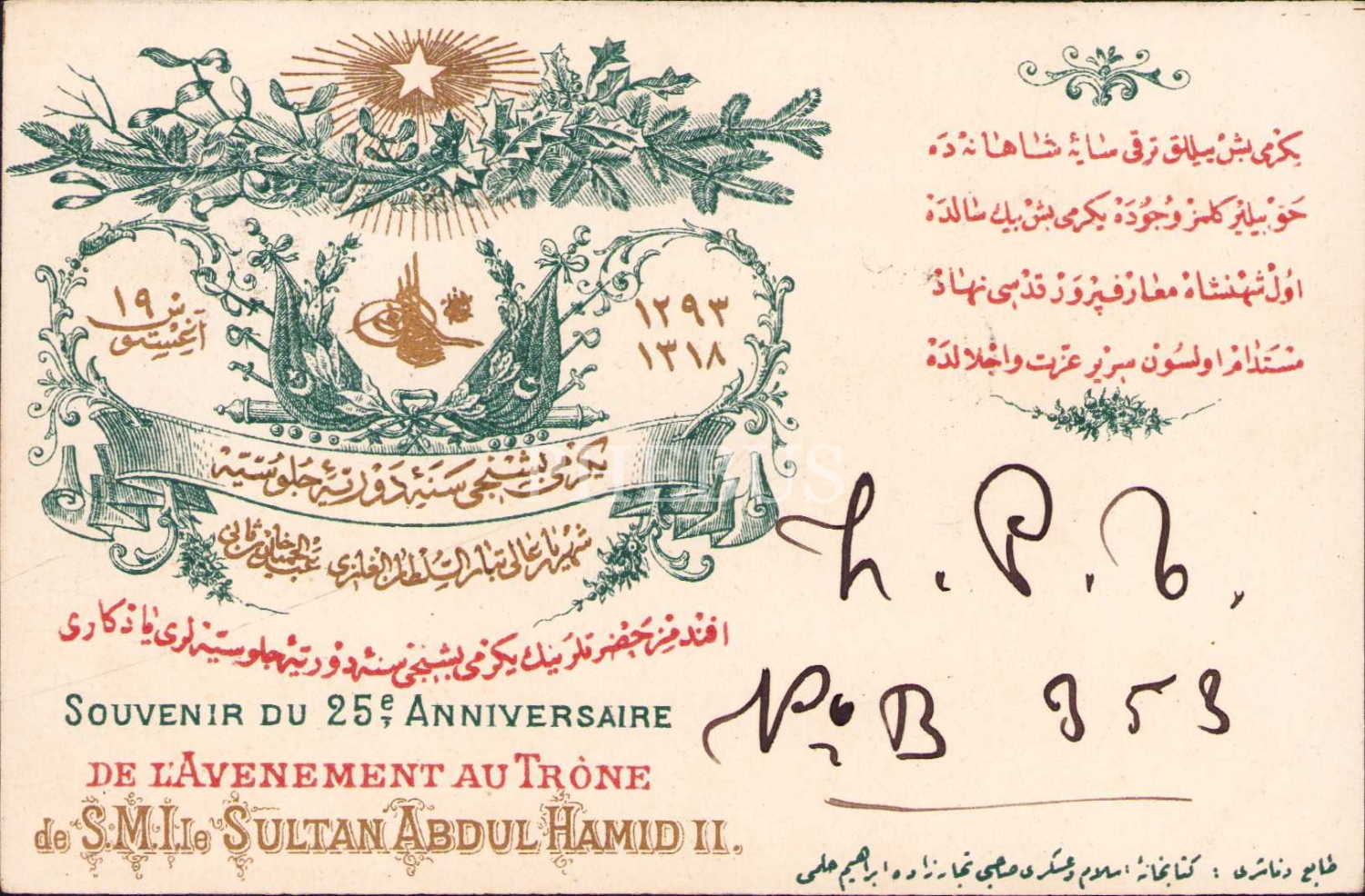 Osmanlı dönemi taşbaskı kartpostal, Sultan II. Abdulhamid'in tahta çıkışının 25. yıldönümü anısına çıkarılmış, postadan geçmiş