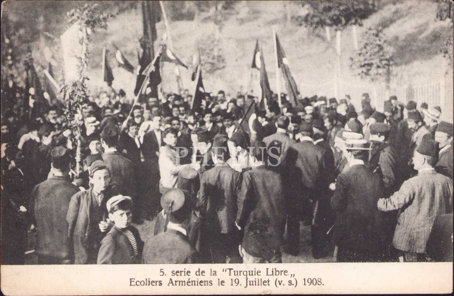 Osmanlı dönemi, II. Meşrutiyet'in ilanı öncesi 19 Temmuz 1908 tarihinde Ermeni okul öğrencileri "Özgür Türkiye" diye slogan atıyor, Editör R. D. Arakelian, Constantinople