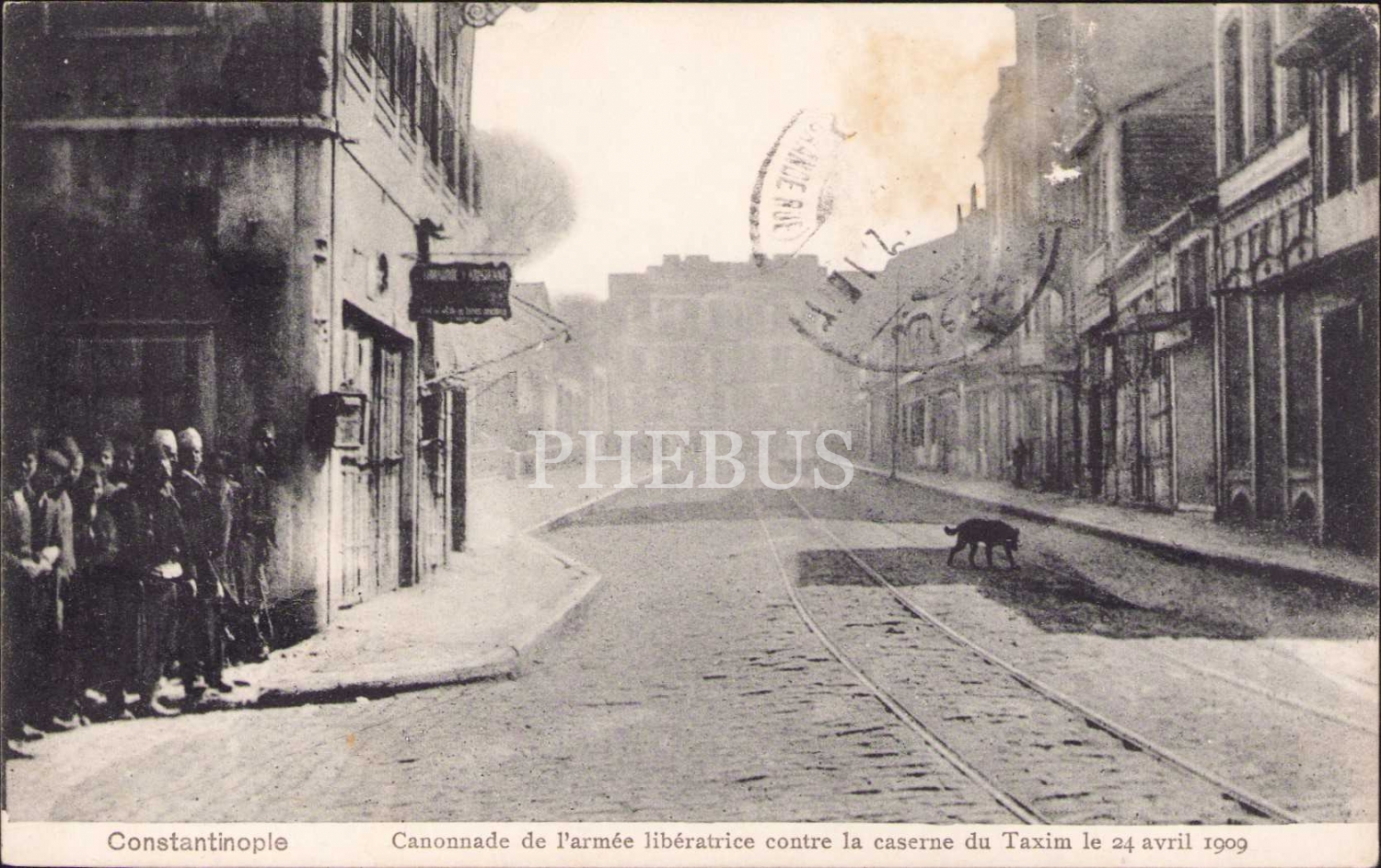 Osmanlı dönemi, 31 Mart vakası döneminde isyancıların Taksin Topçu Kışlası'na saldırma anı, 24 Nisan 1909, Editör Au Bon Marche, postadan geçmiş