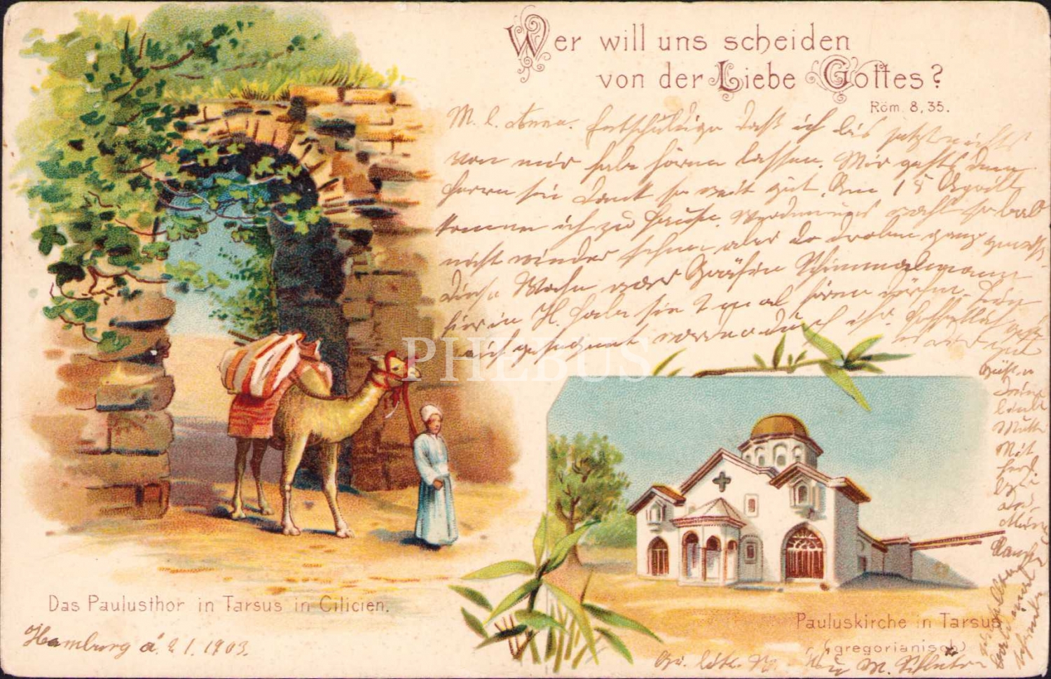 Osmanlı dönemi parçalı kartpostal, Tarsus manzaraları, Almanya baskısı, postadan geçmiş