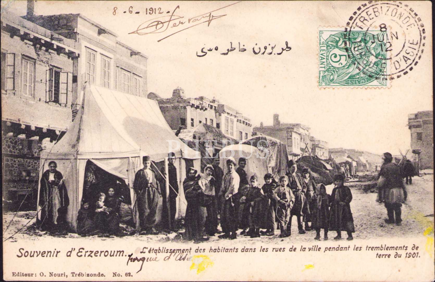 Osmanlı dönemi, Erzurum, 1901 depreminden sonra cadırlara sığınan halk, postadan geçmiş, bir kenarı kırık