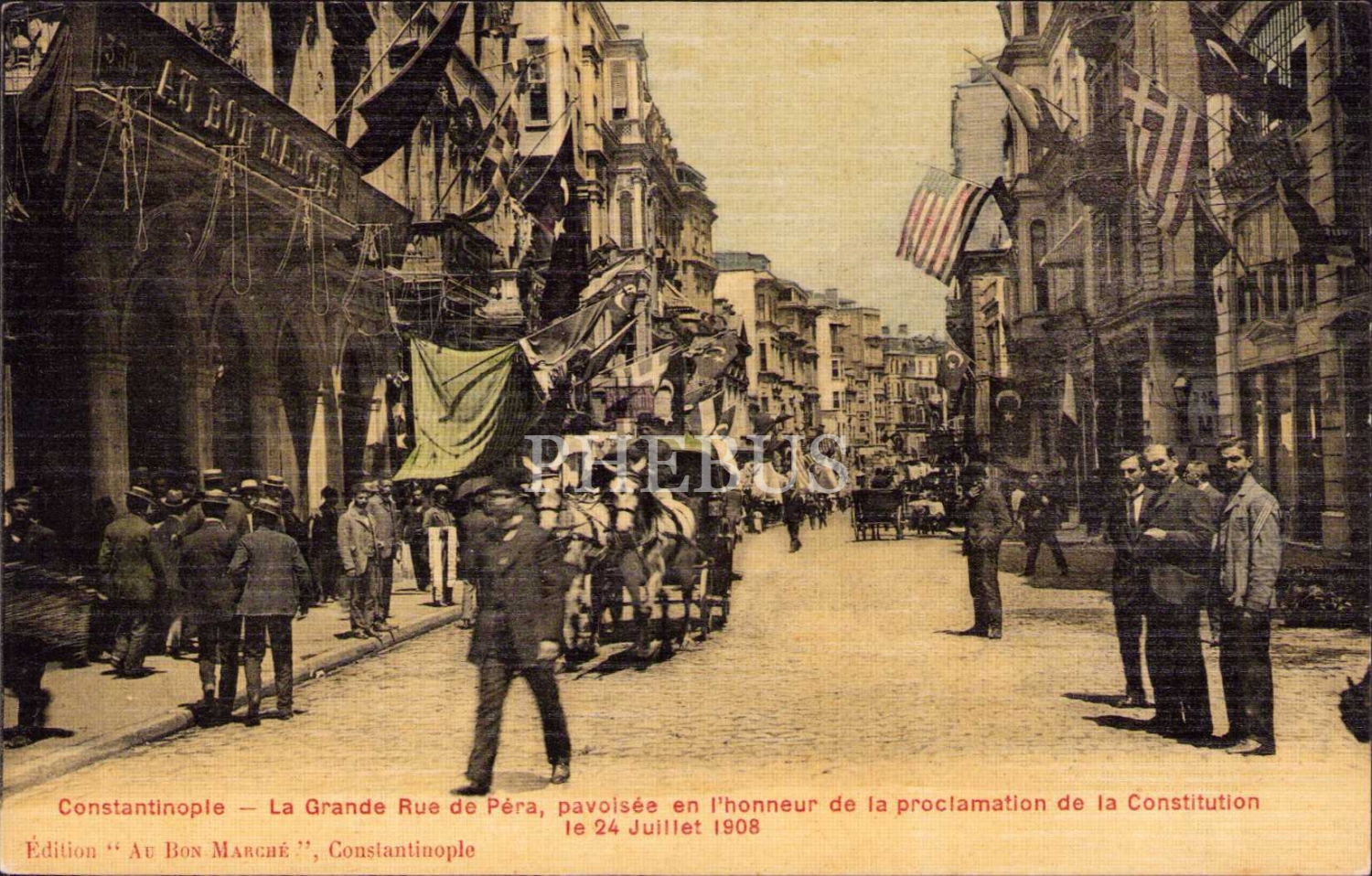 Osmanlı dönemi ipek kartposal, Meşrutiyet Kutlamaları 24 Temmuz 1908 tarihli, Editör Au Bon Marche, Constantinople
