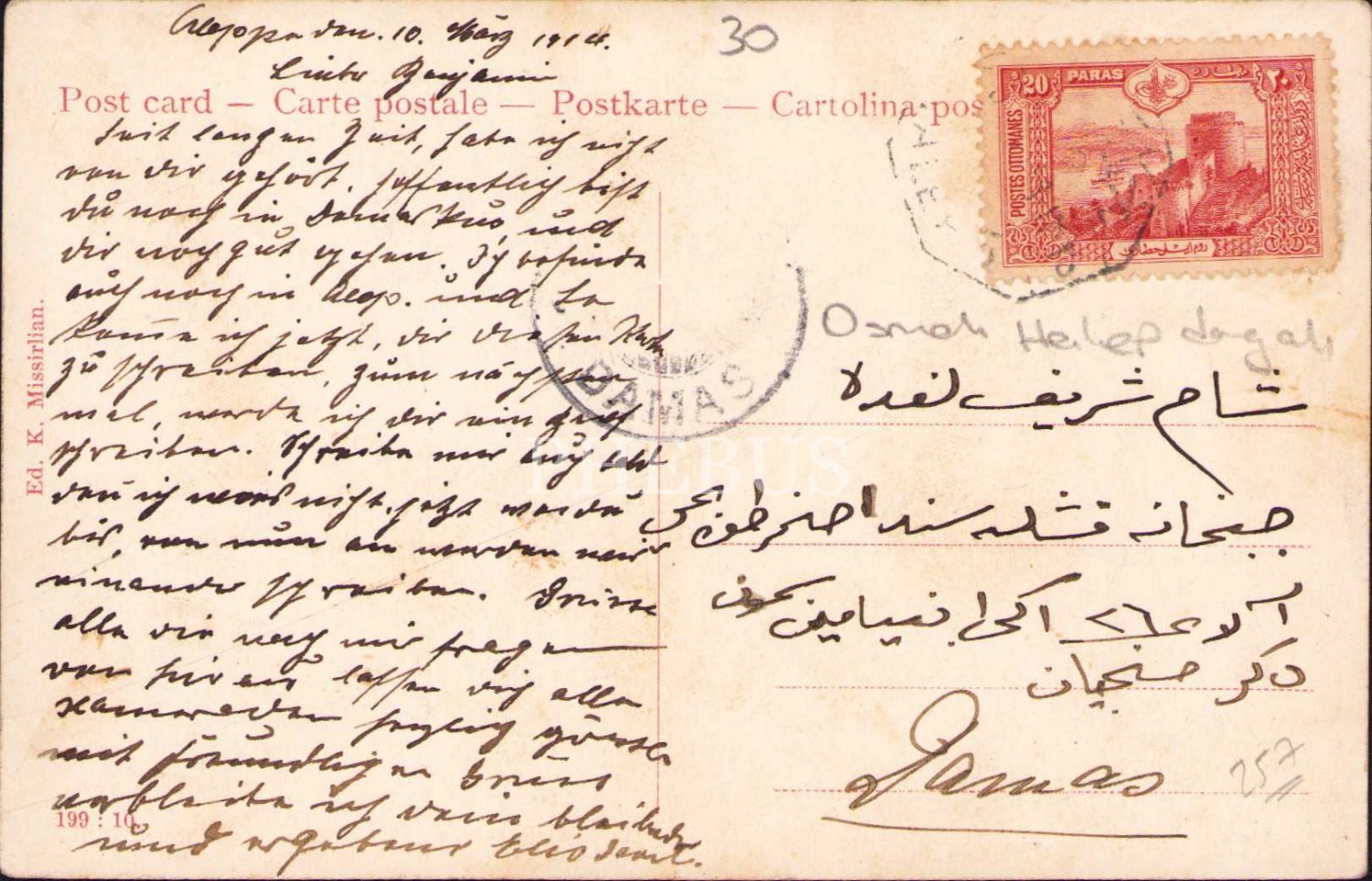Osmanlı dönemi, Halep Kitab Köprüsü, Editör K. Missirlian, arkası Osmanlıca yazılı, Halep damgalı, postadan geçmiş