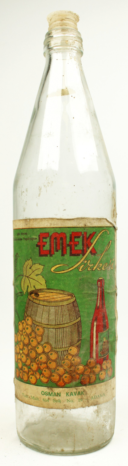 Emek sirkesi şişesi, tekel damgalı, Adana adresli, etiketi üzerinde, 29x6cm