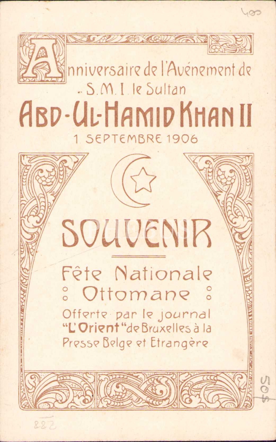Osmanlı dönemi, II. Abdulhamid Han anısına 1 Eylül 1906'da Brüksel'de basılmış kartpostal