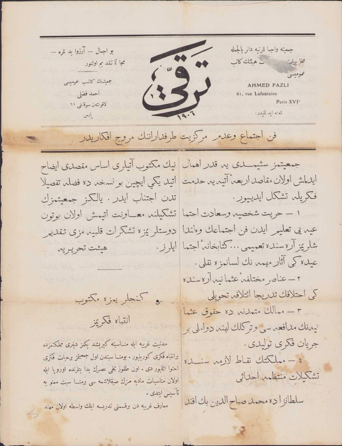 1868-1871 yılları arasında İstanbul’da yayımlanan siyasî içerikli Terakki Gazetesi, 1906 tarihli, Cemiyetin Katibi Umumisi Ahmed Fazlı, Paris baskısı, 4 sayfa, 25x33