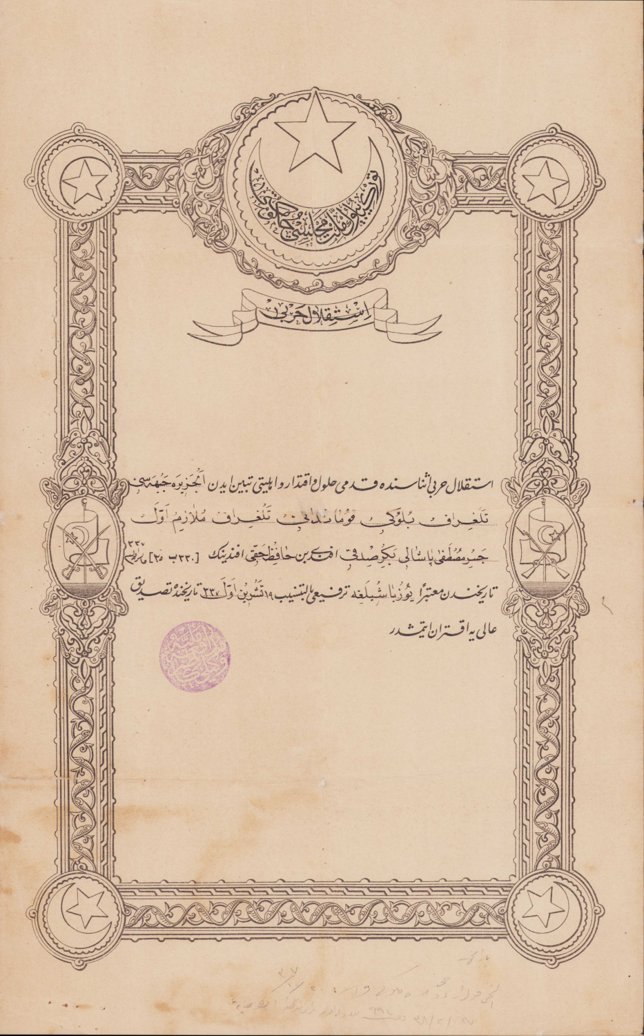 İstiklal Harbi Terfi Beratı, 1337 tarihinde El Cezire'deki Telgraf Kumandanı'nın Caser Mustafa Paşa'ya verdiği Yüzbaşılık terfi varakası, Osmanlıca, 27x44cm