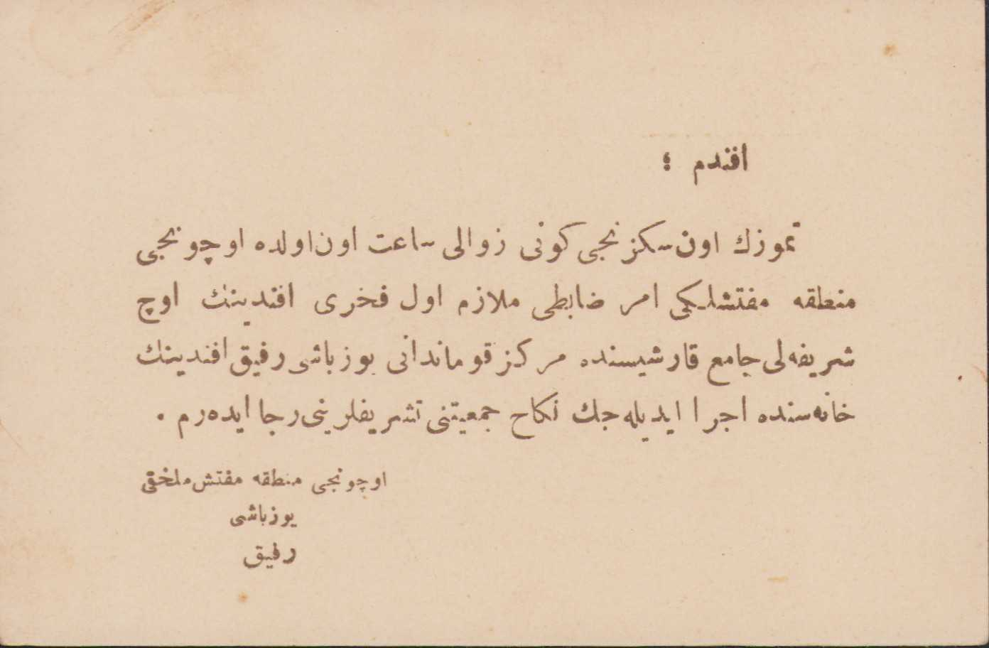 Osmanlı nikah davetiyesi, Üçüncü Mıntıka Müfettişliği Zabıtı Mülazım Evvel Fahri Efendi'nin Üç Şerifeli Cami karşısında Merkez Kumandanı Yüzbaşı Refik Efendi'nin hanesinde yapılacak olan nikah töreni davetiyesi, 12x8cm
