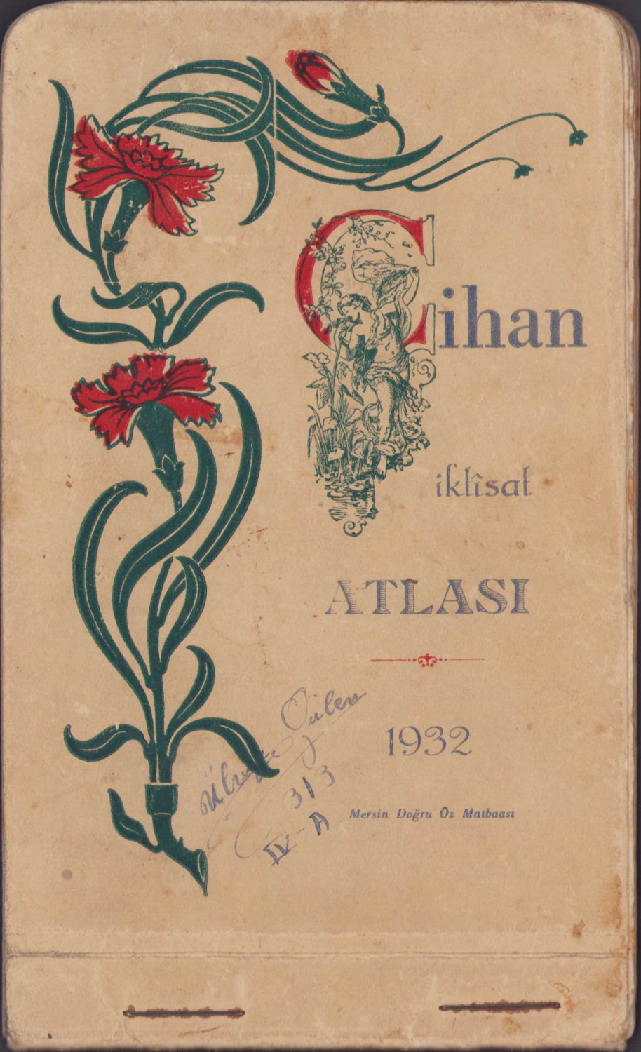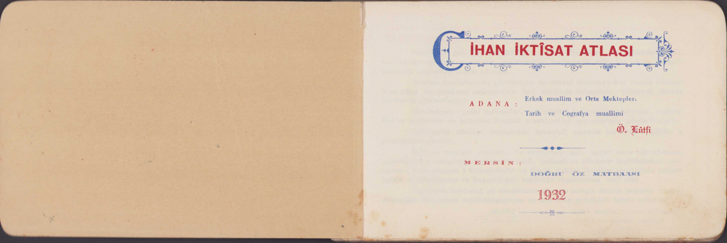 Cihan İktisat Atlası, hazırlayan Tarih ve Çoğrafya Muallimi Ö. Lütfi, baskı Mersin Doğu Öz Matbaası, 1932 tarihli, bedeli 30 kuruş, 14 sayfa, 16,5x10cm