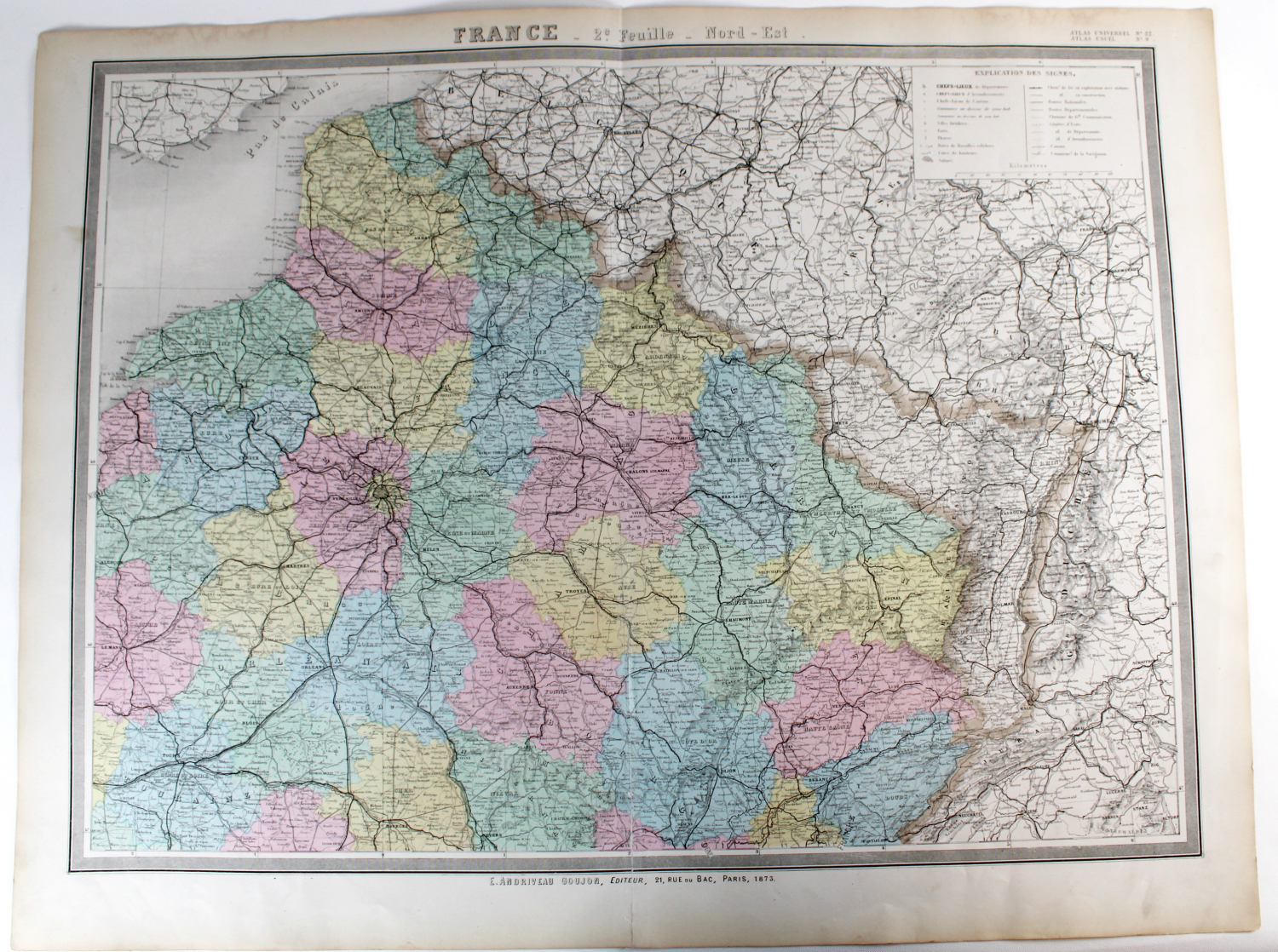 Fransa Kuzey Doğu haritası, Fransızca, Editör E. Andriveau Goujon, Paris baskısı, 1873 tarihli, 70x53cm