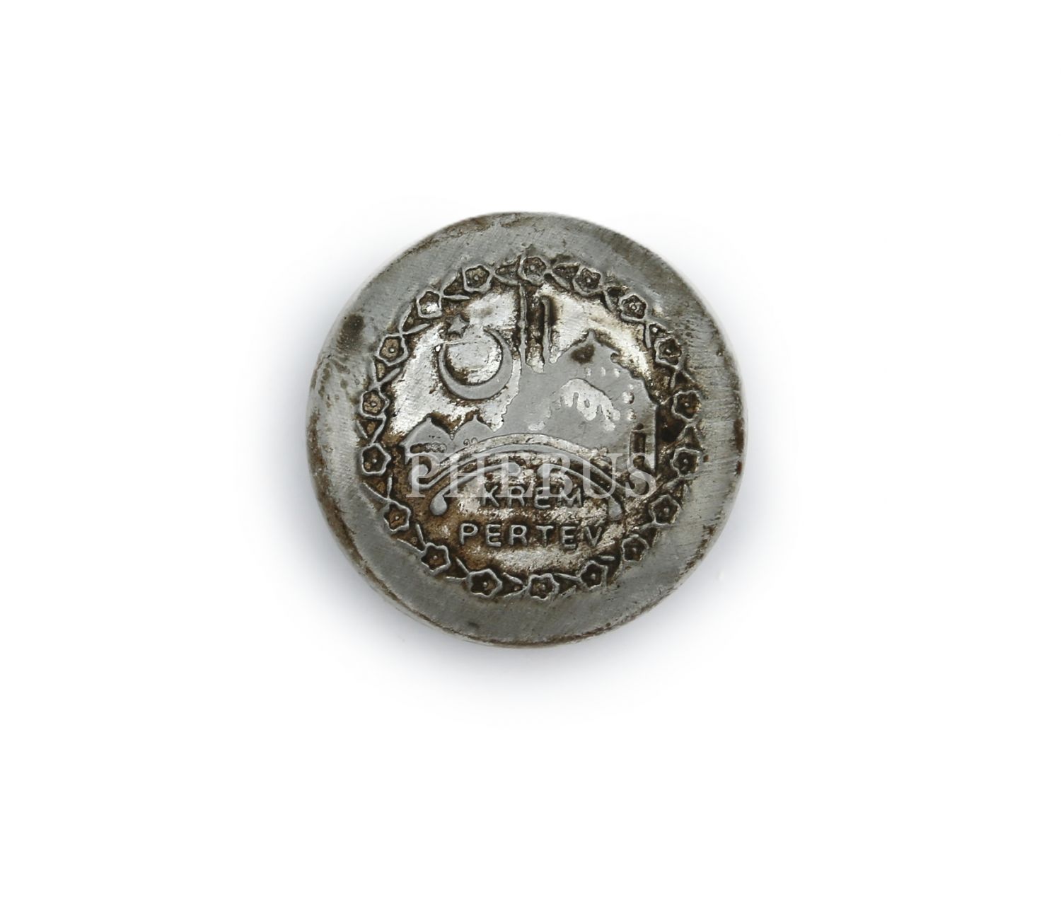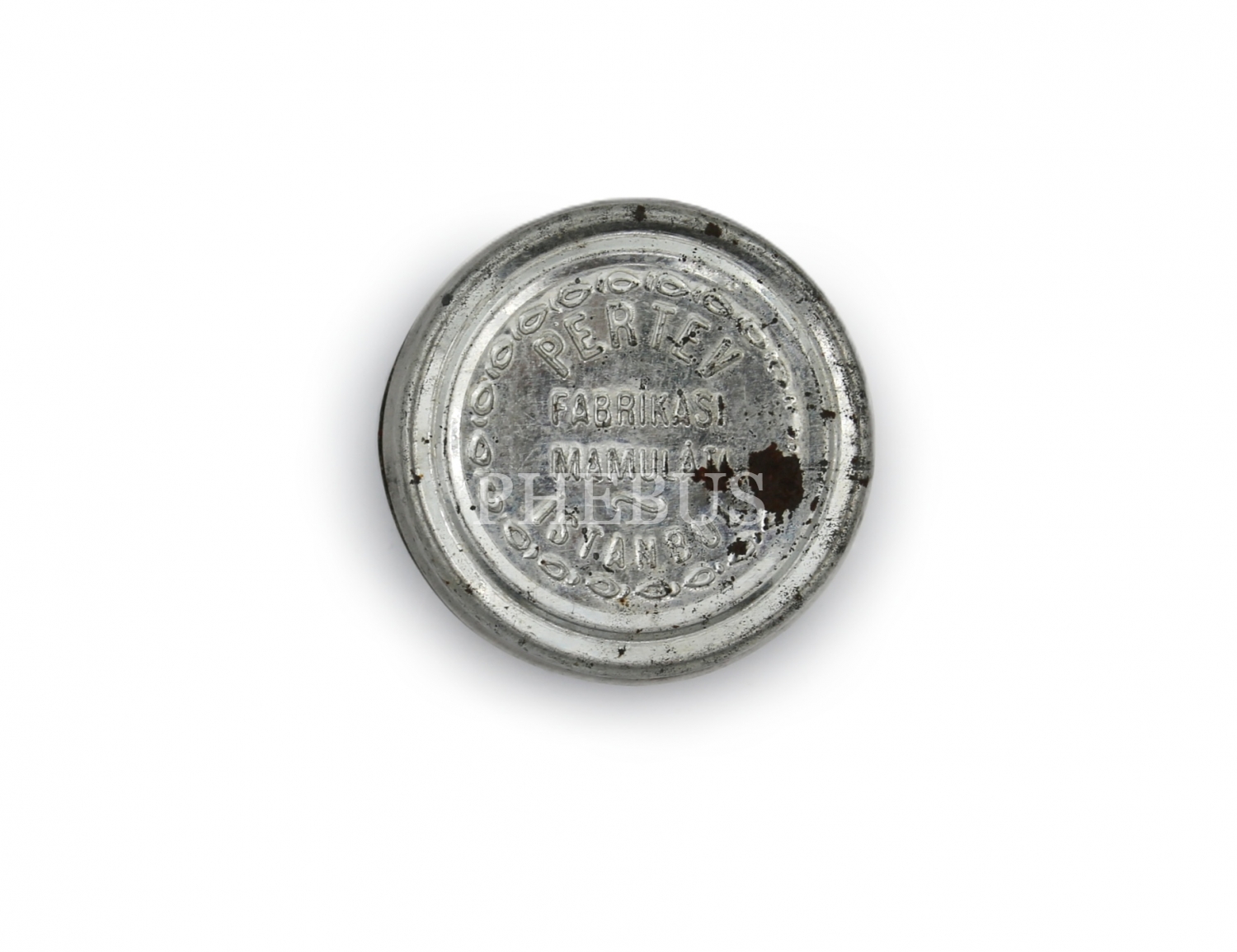 Pertev marka, içi dolu teneke kutusunda, üzeri ay yıldız görselli, 3x1 cm