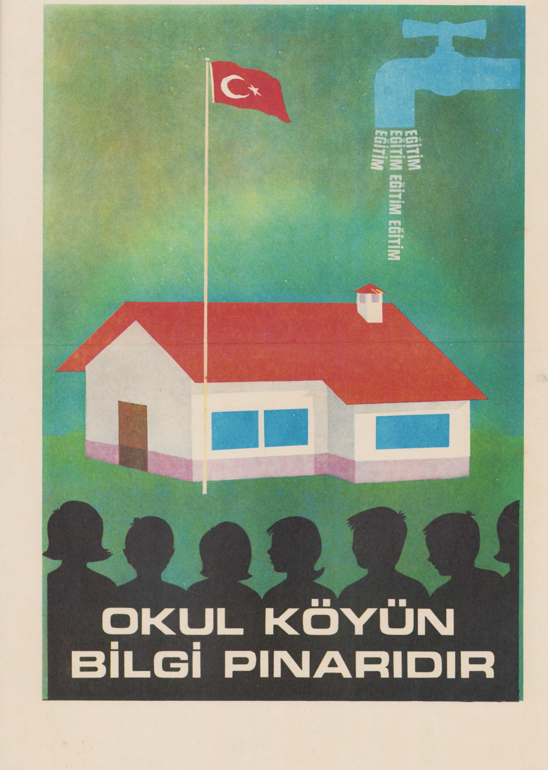 Okul Köyün Bilgi Pınarıdır' yazılı eğitim ve Türk bayrağı temalı afiş, 35,5x49,5cm