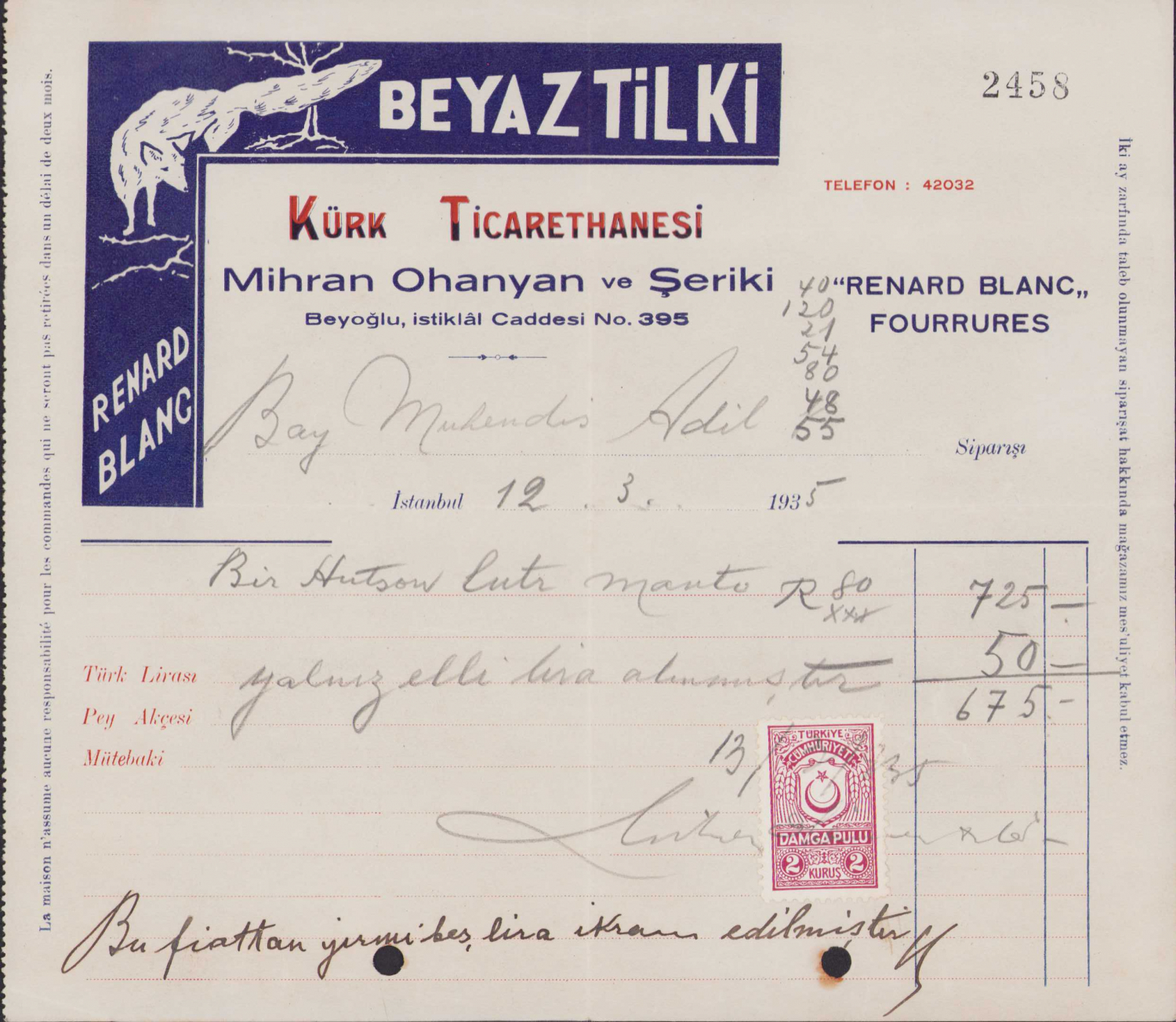 Beyaz Tilki Kürk Ticarethanesi Ermeni Mihran Ohanyan ve Şeriki antetli fatura, 1935 tarihli, pullu, Beyoğlu İstiklal Caddesi adresli, Fransızca-Türkçe, 21x19cm