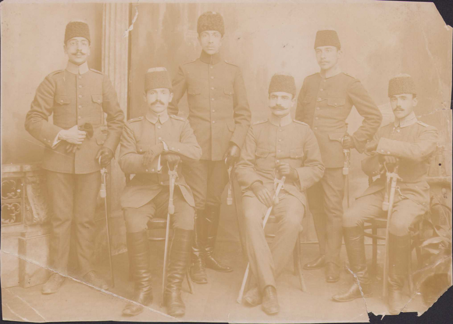 Osmanlı dönemi bir grup Türk subayının hatıra fotoğrafı, püsküllü kılıç, kalpak ve fes detaylı, stüdyo çekim, köşede kesik ve kırık var, haliyle