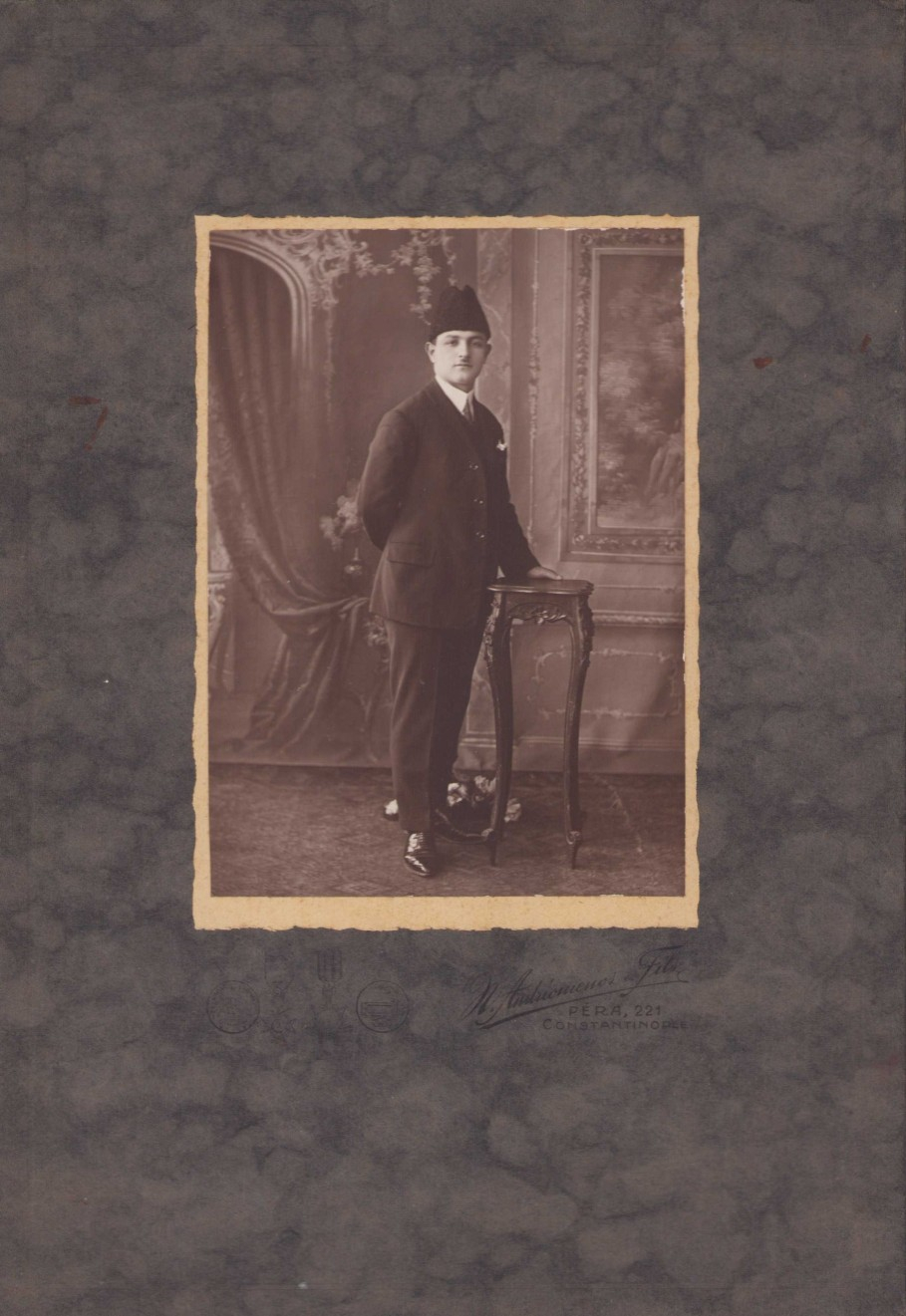 Osmanlı dönemi kalpaklı beyefendi portresi, stüdyo çekimi, kabin fotoğrafı, Foto Nicolas Andriomenos, Pera Constantinople adresli, 20x29cm