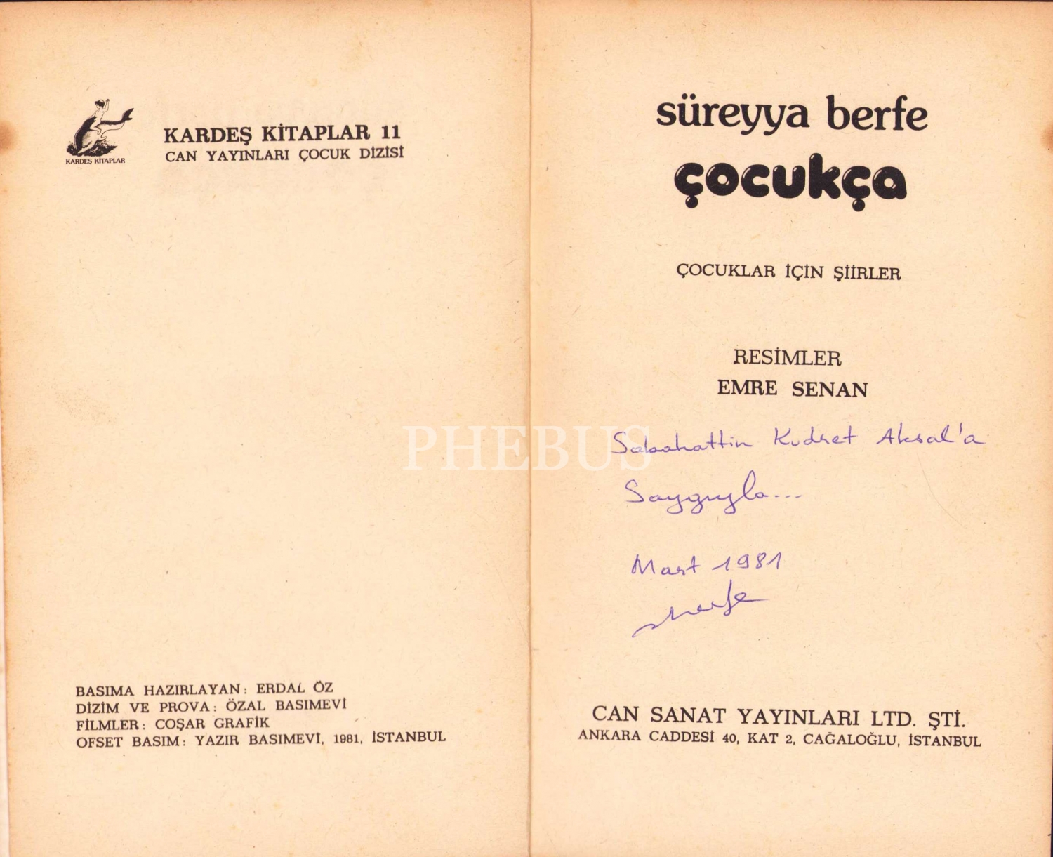 Çocukça, Süreyya Berfe'den Sabahattin Kudret Aksal'a imzalı ve ithaflı, İlk baskı 1981, 76 sayfa