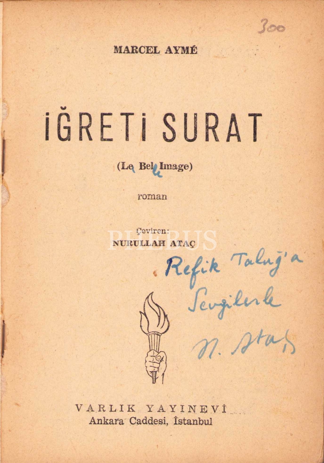İğreti Surat, Marcel Ayme, Çevirmeni Nurullah Ataç'tan Refik Taluğ'a imzalı ve ithaflı, 1955, 182 sayfa