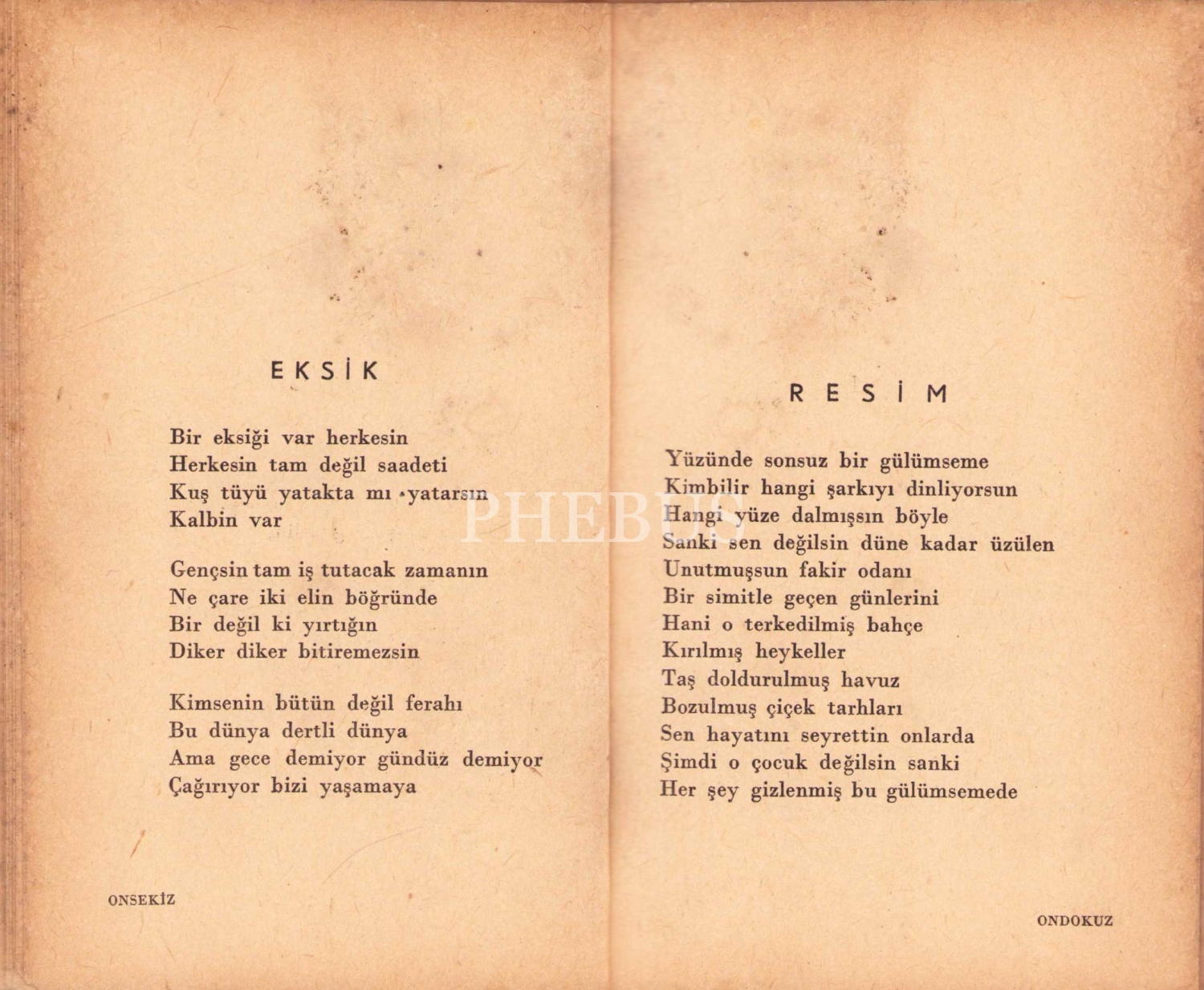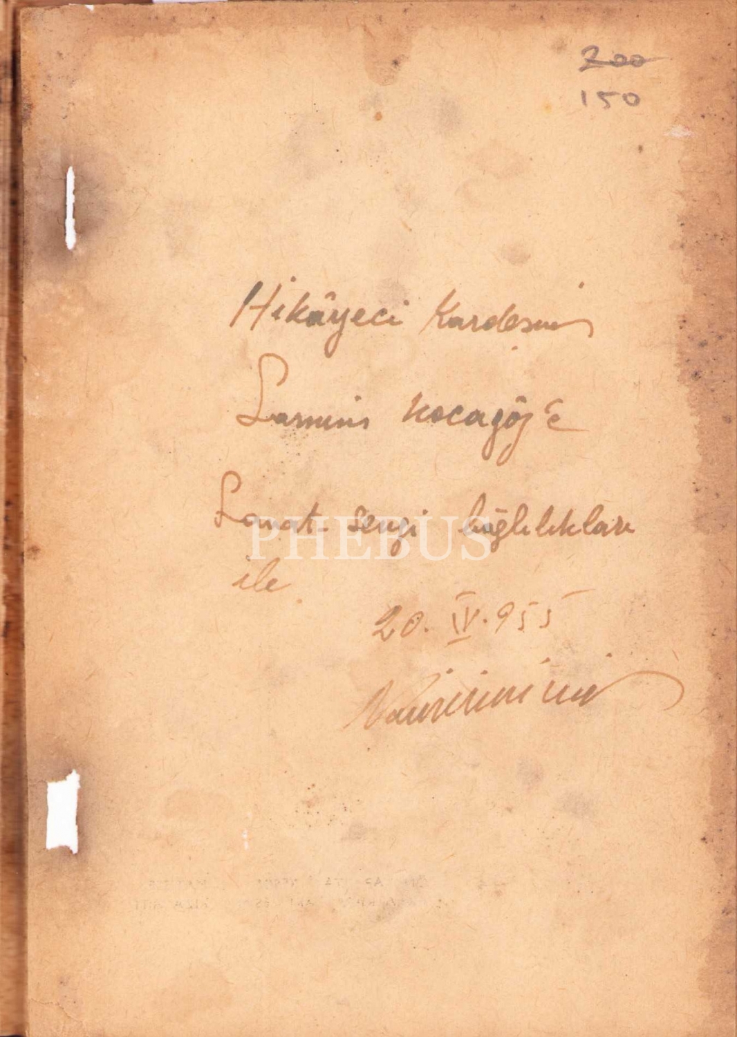 İthaf "Hikayeci kardeşim Samim Kocagöz'e sanat-sevgi bağlılıklar ile" 20.IV. 955. Cildinden ayrılmış ön kapağıyla birlikte hâliyledir.