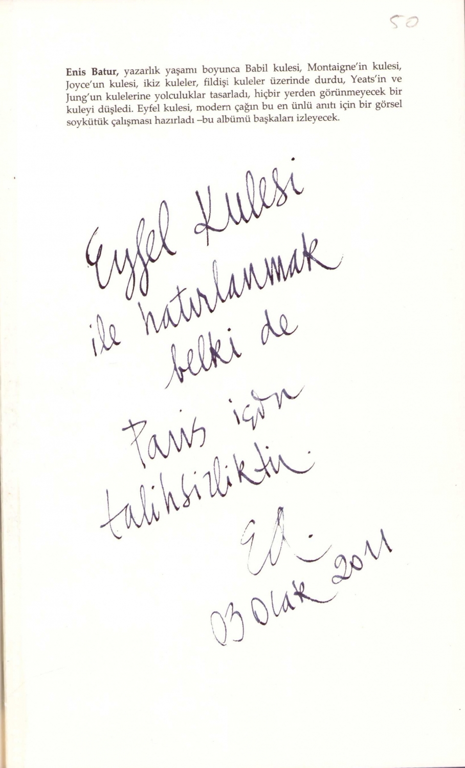 İmza "Eyfel Kulesi ile hatırlanmak belki de Paris için talihsizlikti 3 Ocak 2011" şeklindedir