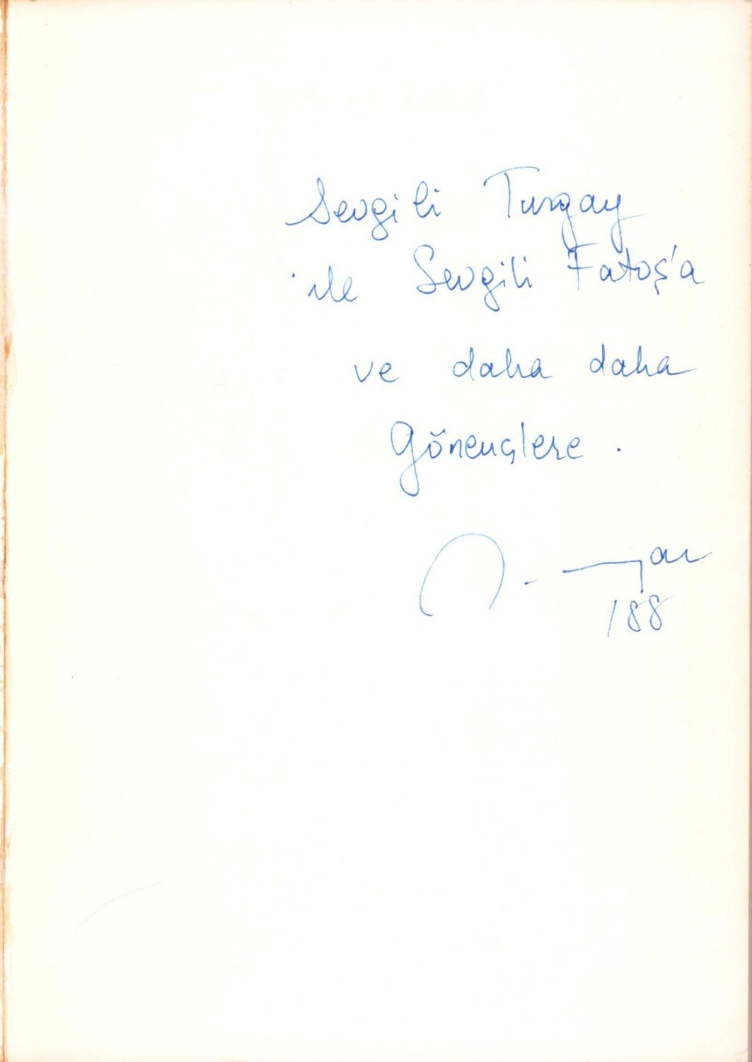 İthaf "Sevgili Turgay ile Sevgiili Fatoş'a ve daha nice gönençlere. 188" şeklindedir