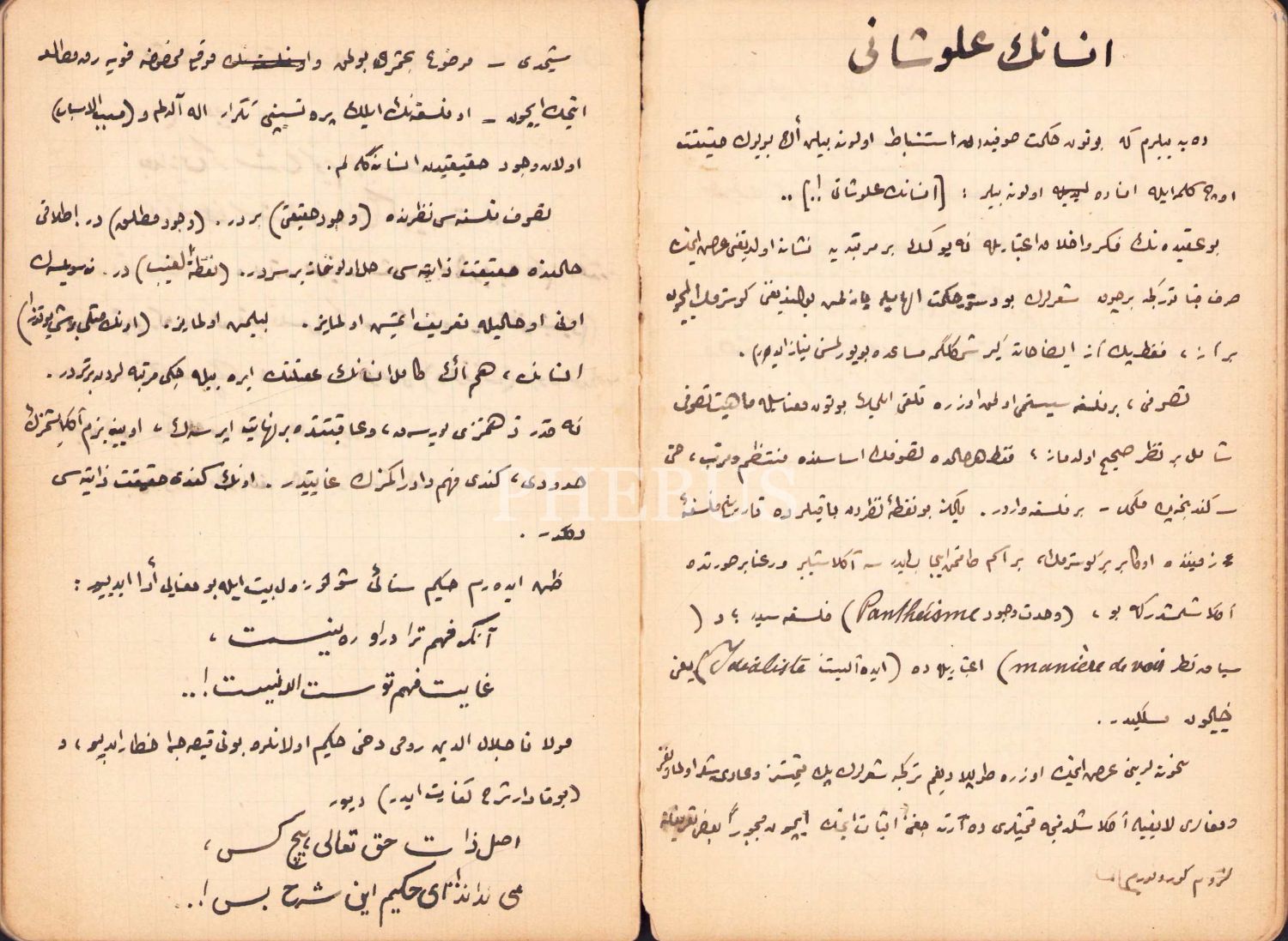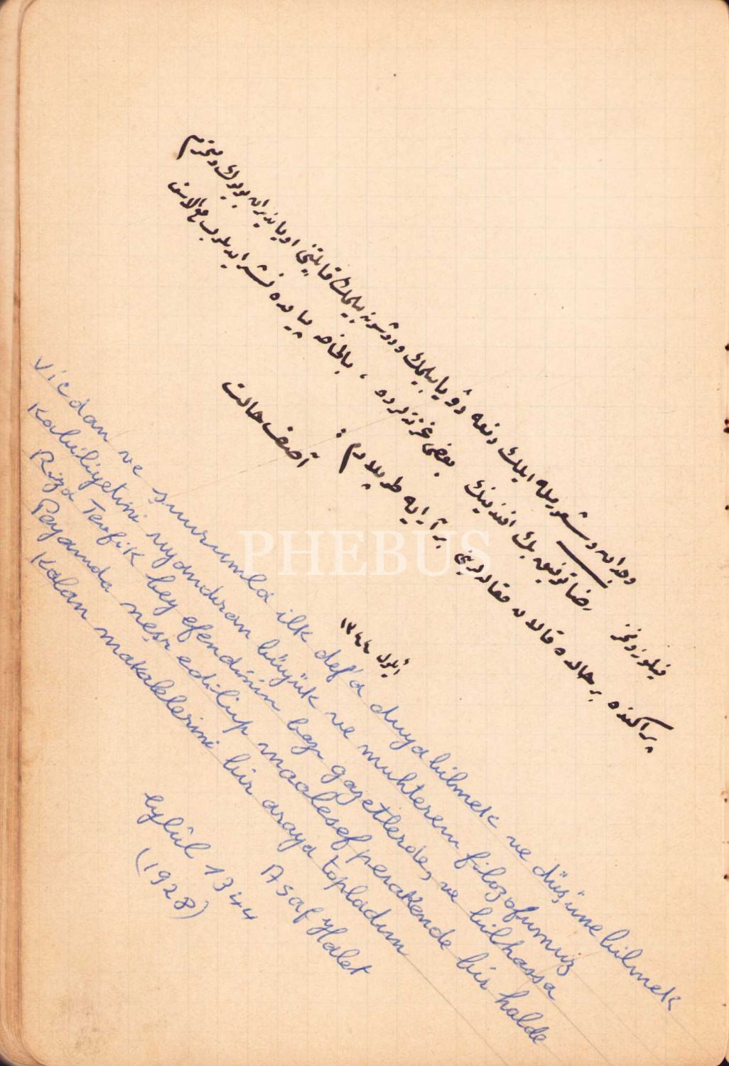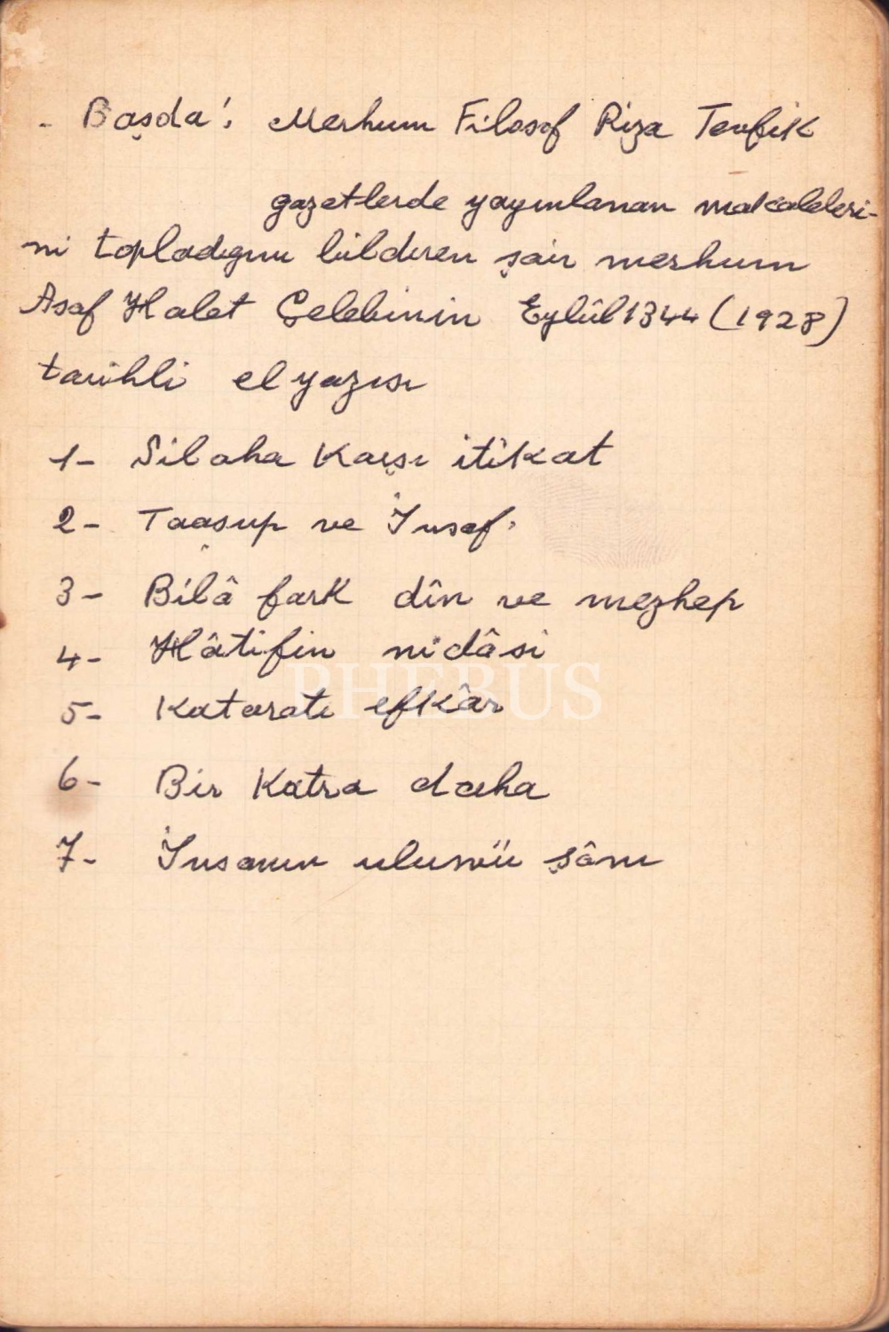 Asaf Halet Çelebi'nin kendi el yazısıyla tutulmuş Osmanlıca not defteri: Filozof Rıza Tevfik'in Makalelerinden Parçalar, 1928 tarihli, 70 sayfa, 18x12 cm