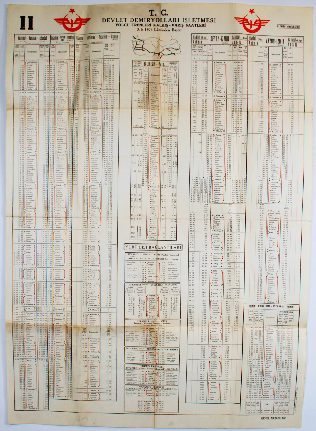 TC Devlet Demiryolları İşletmesi Yolcu Trenleri Kalkış-Varış Saatleri afişi, 1973 tarihli, hizmete mahsus, TCDD Matbaası, İzmir baskısı, 70x100cm