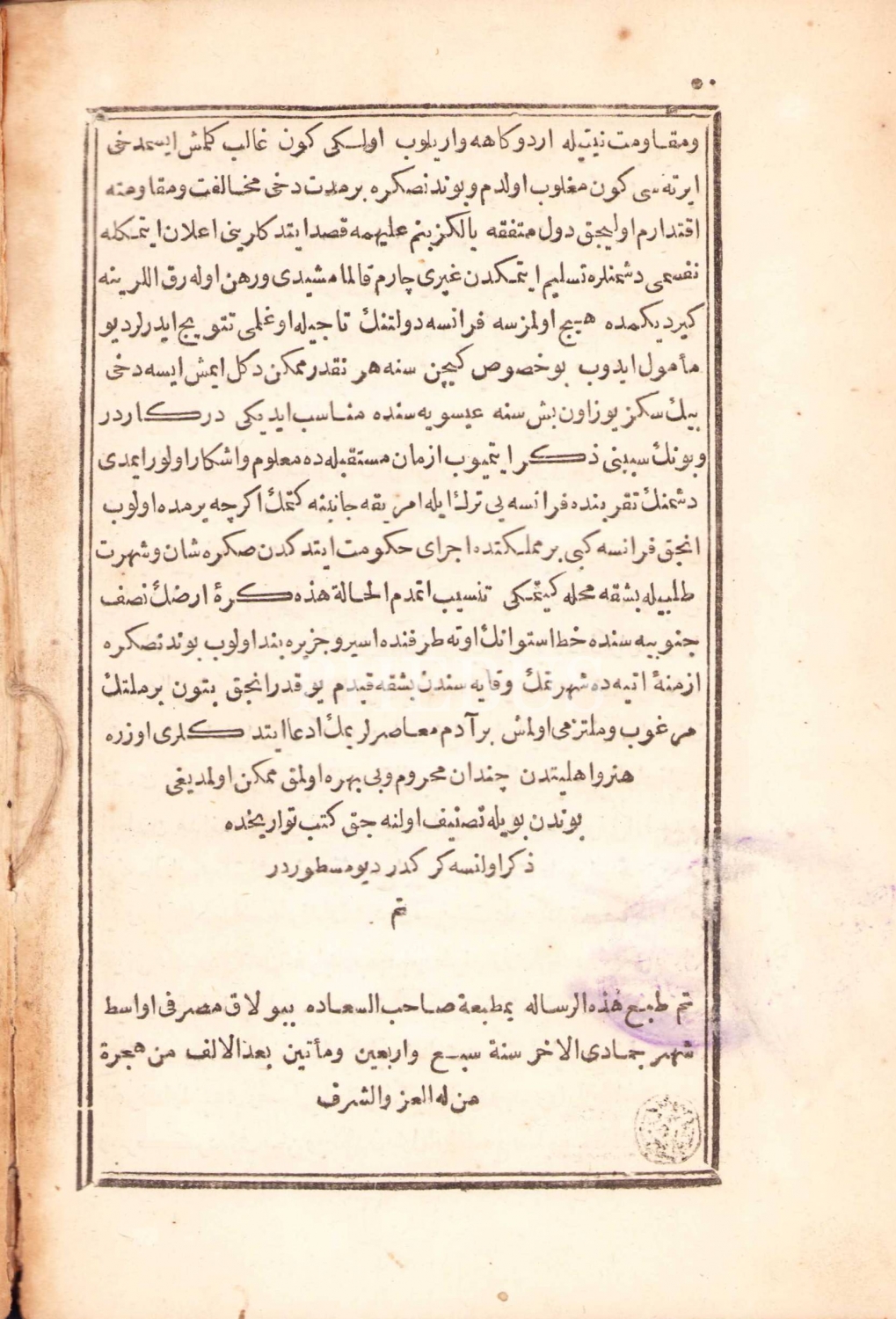 Osmanlıca, Risale-i Bonaparta, Kahire 1247, Bulak Matbaası, 50 sayfa, ÖZEGE 129, 21x15 cm